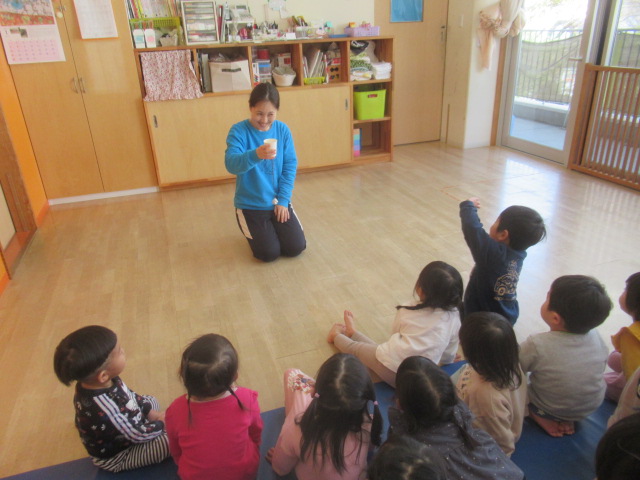 「あっぷっぷ」という絵本を見てにらめっこをしました。頬を膨らませたり目がなくなるほどしわくちゃの顔を見せてくれました。おもしろい顔が得意などんぐりさんです^_^