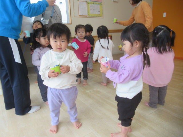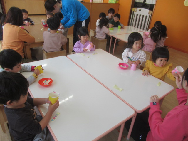 紙コップをシールで飾り付け、穴に紐を通し、そこにアルミホイルを巻き付けて丸めたら出来上がりです。穴に紐を通すことも出来るところは子どもたちにしてもらいました。出来上がったけん玉で遊んでいると「入ったー!」という声がたくさん聞こえてきて嬉しそうな子どもたちでした^_^お家でも遊んでみてください!