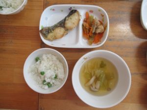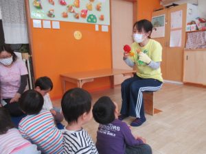 キャベツの中からという手遊びのペープサートを見ました。キャベツが大好きな青虫の家族が順番に登場して、最後はキレイな蝶になります。蝶はお腹が空いているようだったので、リンゴとみかんをあげると元気になりました。どんぐりのお友達にもリンゴとみかんをおすそ分けしてもらい、パクっと食べる真似をして笑顔になったお友達😊美味しかったね!