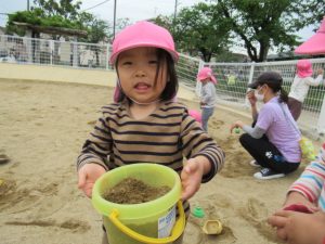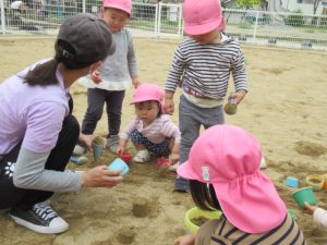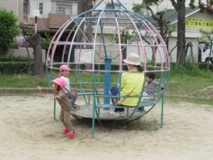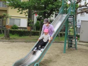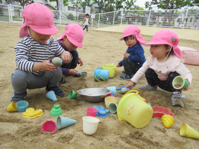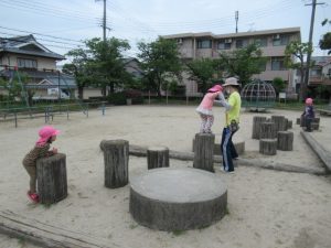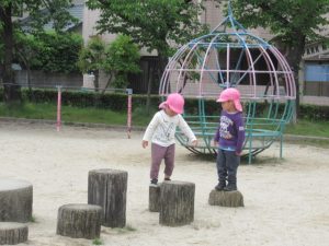 守部公園まで散歩に行ってきました。大きい子はお友達と手をつないで歩き、新しいお友達や小さいお友達は保育士と手をつないだり、ワゴンに乗って行きます。散歩に行く時のルールは「手を離さない」「道路の端を歩く」です。「車が来たよ」「ここは穴が空いてるから気を付けてね」等など、保育士の声を良く聞いて、お友達の手を引いて道路の端に寄ったりしながら歩けましたよ。公園では、タンポポの綿毛をフーっと吹いて飛ばしたり、砂場でアイスクリームの型抜きを使って上手に作れたのが嬉しくて何度も繰り返し作ったり。丸太の遊具に挑戦し、全部出来た時には「どうだ!」と言わんばかりの満面の笑みを見せてくれました😊