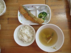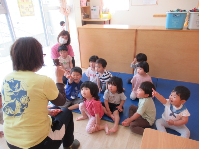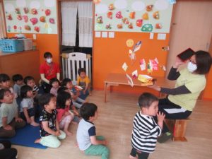 お集まりで、ちいさな箱をみんなにみせました。何が入ってるかな~と子どもたちに聞いてみると、「クッキーかな」「おかしかな」色々な言葉が出てきました。さん・に・いち・ぜろで開けてみようか?、みんなで数えると…次々にぴよんぴょんがえるが跳び出しました。簡単なびっくり箱のようなものでした。ぴょんぴょんがえるは飲料パックを切ったものと輪ゴムで作りました。小さいお友だちもいるので、自分でぴょん!とジャンプさせることはまだ難しいようでしたが、箱から跳び出すのはびっくりしつつも楽しいようでした。何度か繰り返し、遊びました。「もう一回して~」という声も聞こえましたよ。