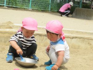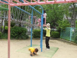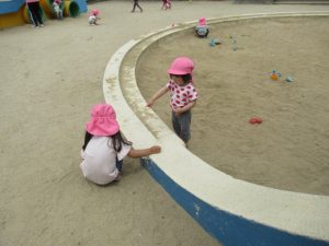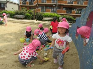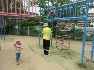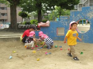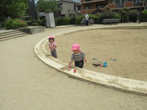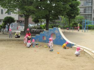 近くの公園へ遊びに行きました。遊具で遊んだり、ありや、小さな虫を見つけて眺めてみたり、木の実を見つけたり楽しめることがたくさんありました。桜の木には、小さなさくらんぼのような赤い実ができていて、せっせと拾い集めてたのしそうでした。ありの巣をみつけるのもお手のものになってきたお友だちもいますよ。