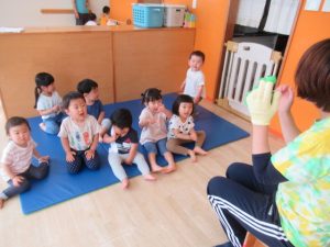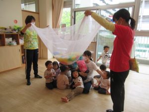ちょうちょが飛んできて蜜を飲んだり、オーガンジーの中に集めて上から下からとわらべうたにあわせて動かしてやるとうわーと口をあんぐりあけて見ていましたよ!最後にはザパーン!とオーガンジーを外してポンポン花が上から飛んでくるとキャハハキャハハと笑顔が見れましたよ!