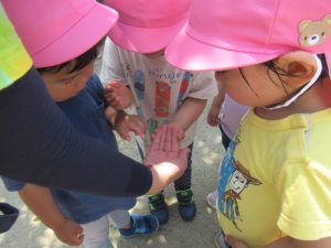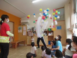 苦手なお友だちもいてるかもしれないので最初は一人ずつそっとお花(ポンポン)を配りました。