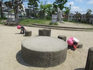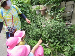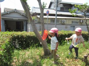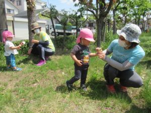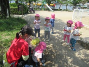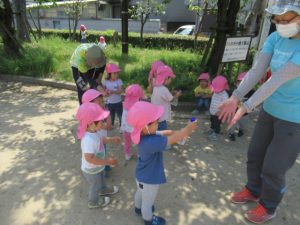 今日は暑かったので、スプレーの小型サイズを持っていき遊びながらミストを感じる事が出来る一石二鳥な遊び道具を持っていきました。気に入ったお友だちはずっと楽しんで色んな保育士やお友だちにかけてはお互い喜びあって楽しんでいましたよ!砂場は陰もなかったので、日陰の場所で水などをバケツに用意して遊具で遊びました。ブランコや花を摘んだり、木の影に隠れてぐるぐる走って見つけ合いっこして楽しんだりたくさん遊んで帰ってきました!
