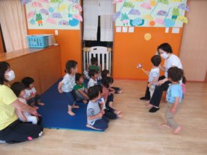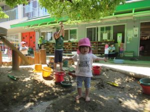 朝のお集まりで、「どろんこももんちゃん」という絵本を見ました。ももんちゃんたちがどろんこの車を楽しそうに作っているのを見てから、どんぐりさんも園庭でどろんこ遊びをしよう!と伝えると、笑顔になった子ども達😊