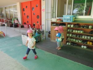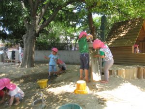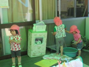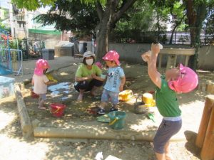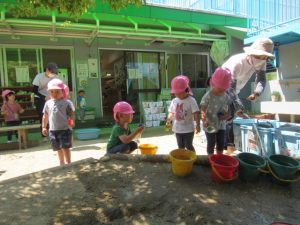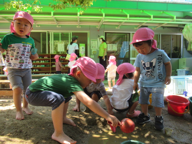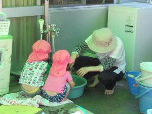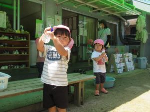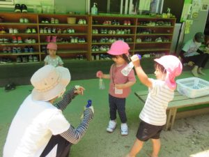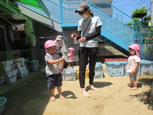 早速、帽子をかぶって園庭へ。裸足で遊ぼうねと声をかけて、裸足で遊びました。小さい子や裸足が苦手な子は靴を履いて出ました。ホースで水をまいて砂場に水溜りを作ると、嬉しそうに水溜りの中へボチャン!「冷たいねー」と、まだ冷たい水の感触を肌で感じているようでした。タライの水を自分でくんで、スプレーに水を入れてシュッシュッと水をまいたり、自分にかけて「冷たーい!」と喜んだり😊少し水が苦手なお友達は、窓にスプレーで水をかけて遊んだり、水で色んな遊びを展開する子どもたちの姿が見られました😊