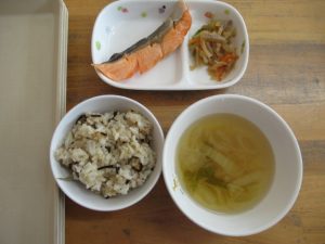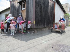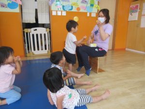 箱の中に色んなものを前もって入れておいて、子ども達の前で何かなにかな~と一つずつ出しました。ままごとのたまごやき、おにぎり手づくりのマラカスに小さいうさぎのマスコット人形などなどです。「朝、たまごやき食べてきた人~?」とやり取りしたり、マラカスに合わせて歌をうたったり楽しいひとときでした。