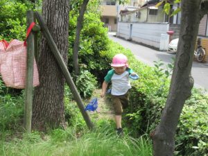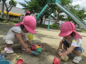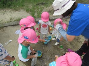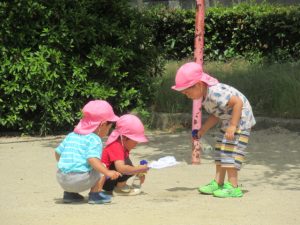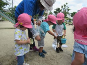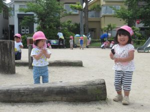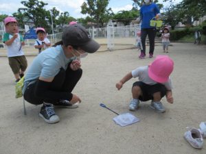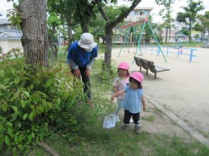 公園に遊びに行きました。どんぐりさんの最近の公園遊びの必需品は虫を追いかけるための網、霧吹きです。虫取り網を使って、モンシロチョウを追いかけて楽しんでいる子ども達です。霧吹きは、自分やお友だちに、大人ににシュッシュして(笑)逃げて笑って楽しんでいます。暑さも少しずつ増してきました。砂遊びは木陰におもちゃを広げたりしています。今日はビニール袋に水を入れて穴をあけて、少し水遊びもしました。