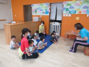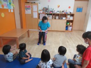 朝のお集まりで絵本を読みました。最初は泳ぐのが苦手だったアオくんが魚たちの応援によって少しずつ泳げるようになって最後にはスイスイ泳げるようになったお話です!魚たちもたくさん出てきて絵を見るだけでも楽しめる絵本です。