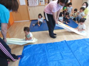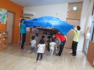 雨でお散歩にも行けないので、海に出かけようとブルーシートの波がみんなの頭の上をザバ〜と何度も通りかかるとみんなも波🌊に合わせて一緒に動いて楽しんでくれました!