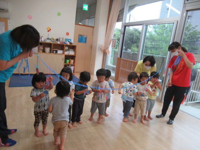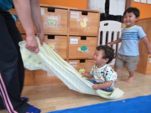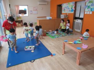 今度は島の間に魚がたくさんいます!二つずつ捕っても良いよ!と約束一つしてみんなでレッツゴー!選んでる間に横からヒョイ!と取ったり取られたり💦そんな時どうするかな?と様子を見ながら見守っています。みんな魚を摂ることが出来ました^ ^少しずつルールのある遊びなども入れながら楽しんでいきたいと思います。