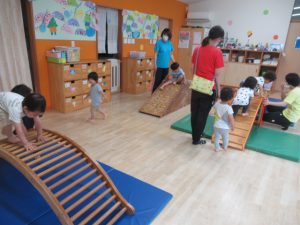 その後はサーキット遊びをして滑り台や太鼓橋で楽しみました。滑り台では色んな滑り方を見せてくれたり、滑り台の下の穴の中に入ってお家ごっこしたりたくさん身体も動かして遊びましたよ!
