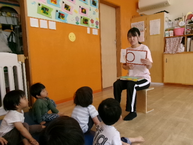 丸を描いた画用紙を見てもらいました。「あれ?赤い丸しかないね?」と言いながら画用紙をスライドさせてみると…りんごが出てきました。「りんご!」と、出てきたもの指差して喜んだり、嘘っこで取って食べる真似をしていました。同じようにオレンジの丸がみかんになり、