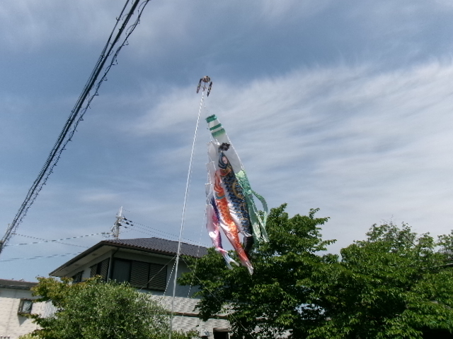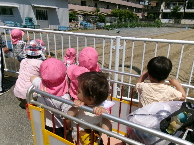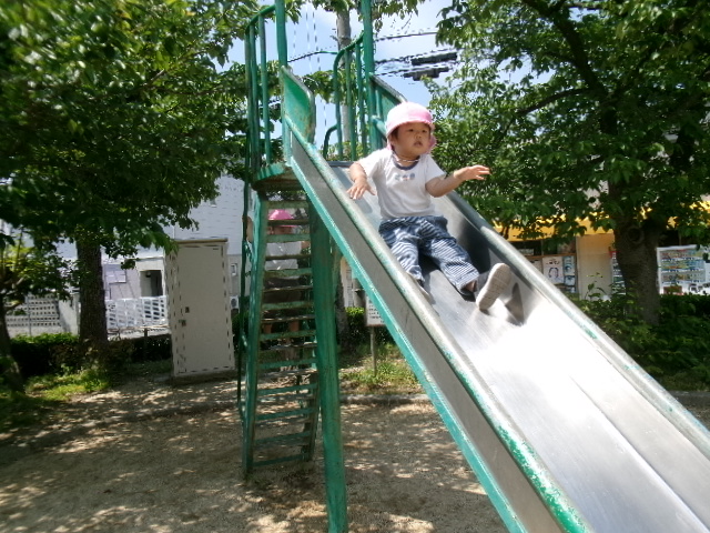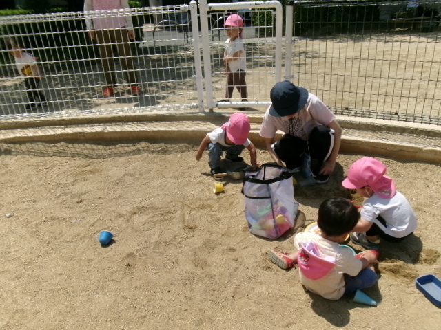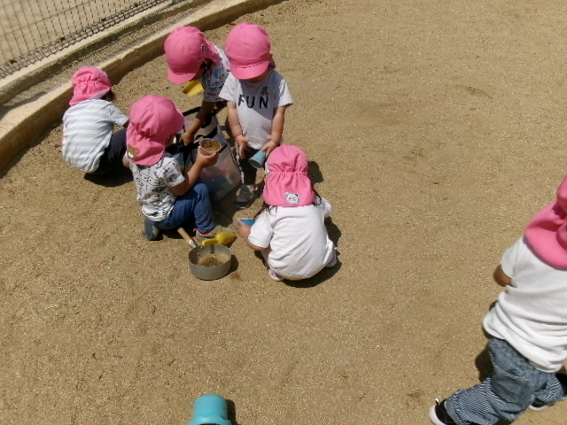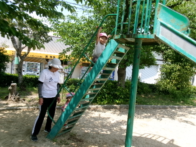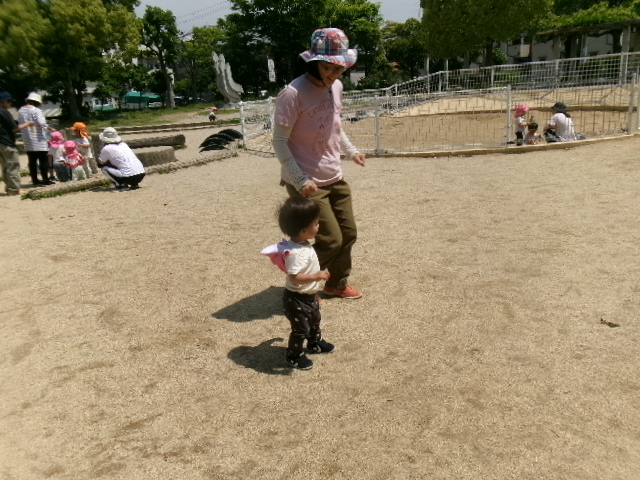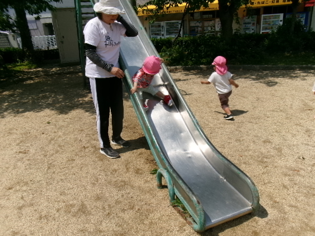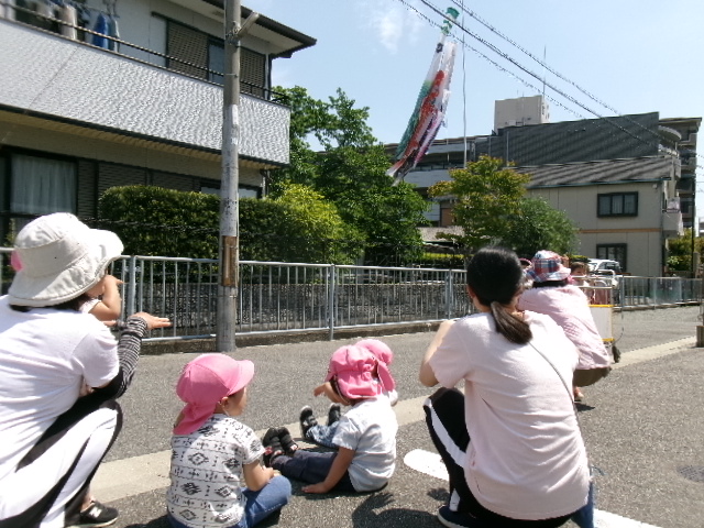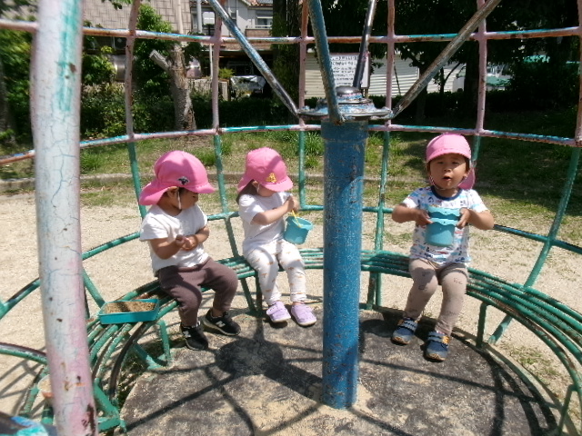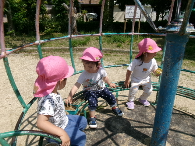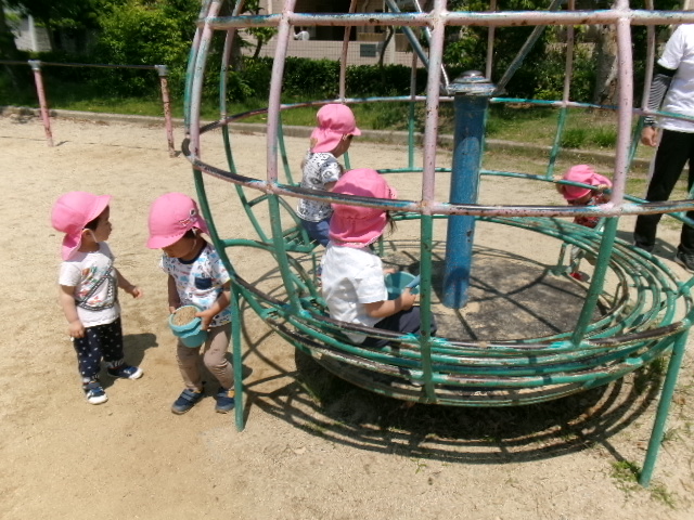 夏日のように気温が高いのでお茶を飲んで水分補給してから公園に出発しました。途中の道で鯉のぼりを見つけると「鯉のぼりいた!」と喜んで見上げていました。鯉のぼりが止まってしまうと「頑張れー!」と言ってあげたり、手をパタパタ動かして風を送って泳ぐお手伝いをしてくれる優しい子どもたちです(^^)公園では滑り台や砂場でのアイス作りも人気ですが、草むらでアリを見つけると追いかけて見たり、何かあるかな?と探索することも楽しんでいましたよ。