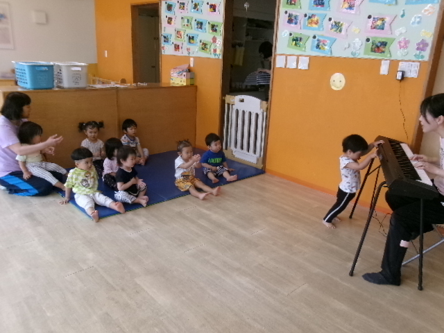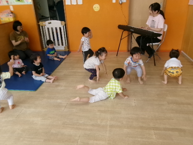 どんぐりころころ、まつぼっくり、カエルのうたなどうたいました。みんながよくうたっていたのはどんぐりころころのうたでした(^^)知っているうたが聞こえてくると体を揺らしたり一緒にうたったりしていましたよ!