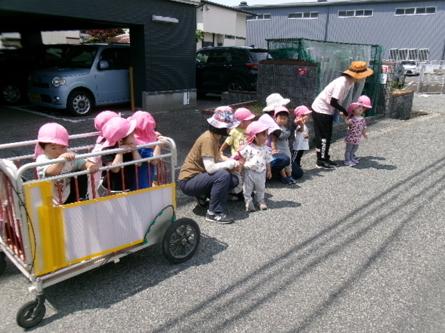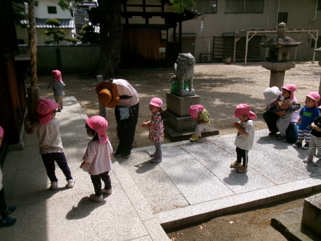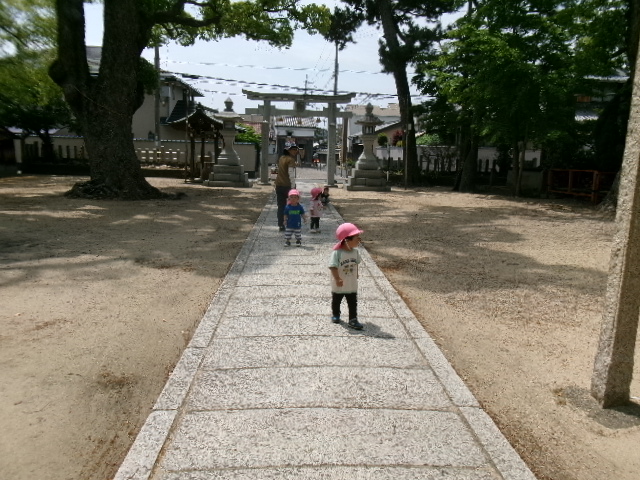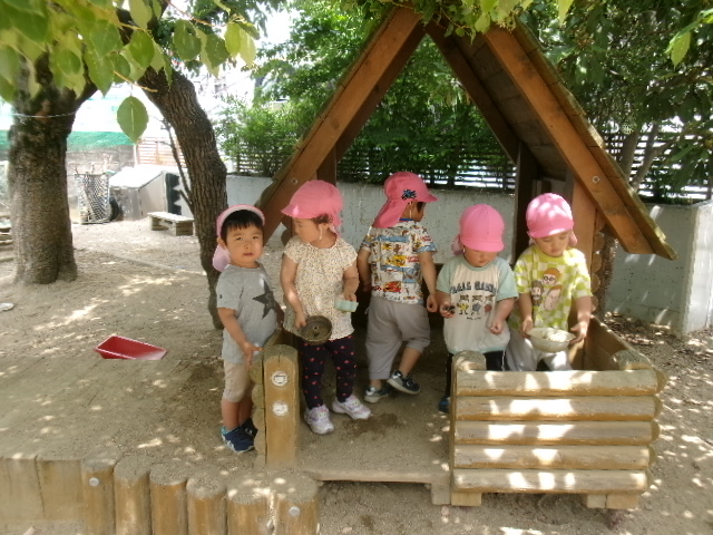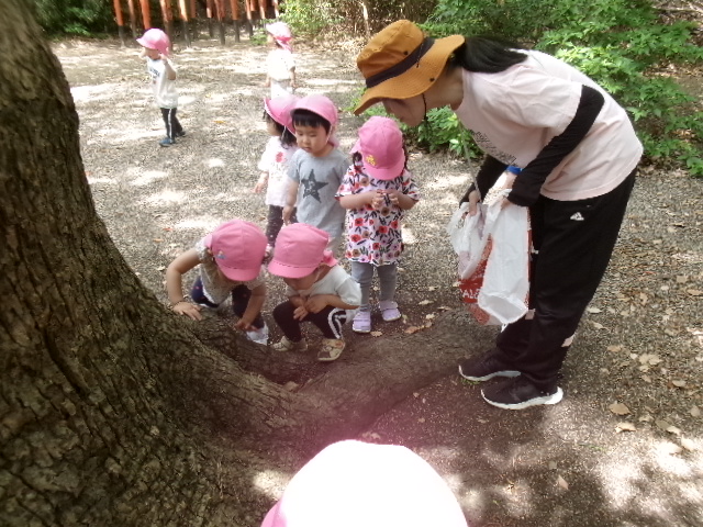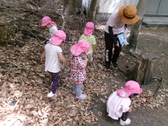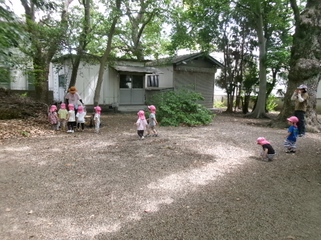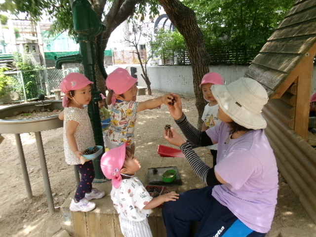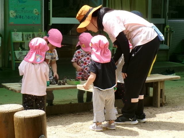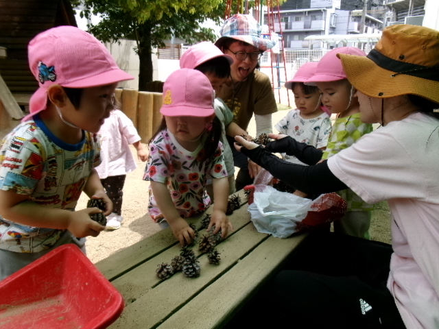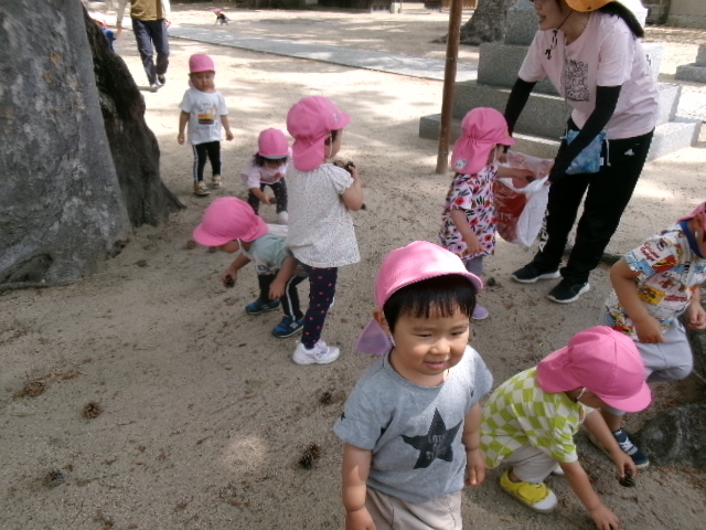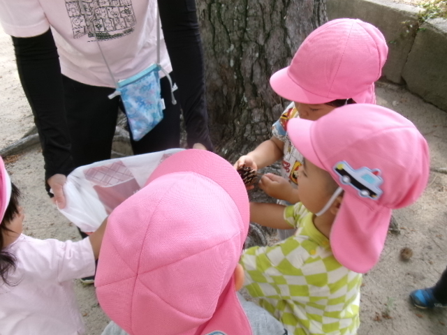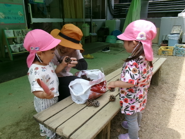 以前から守部神社の前を通る時にまつぼっくりがたくさん落ちているのを見ていたどんぐりさん。今日はそのまつぼっくりを拾いに神社へ行きました。着くと掃除がされた後で、まつぼっくりが落ちていない?!あっちにないかな?こっちにないかな?と探し歩いていると、まつぼっくりを見つけたどんぐりさんが、「見つけたよー!」と教えてくれました(^^)わーい!と喜んで両手いっぱいに拾い集めたまつぼっくりを持ち帰り、園庭で唐揚げにしたり、味噌汁にしたり、ままごとをして遊びました(^^)