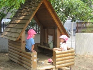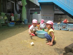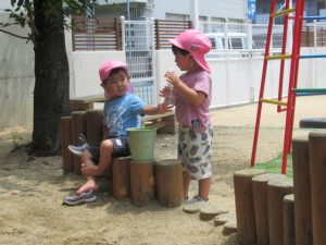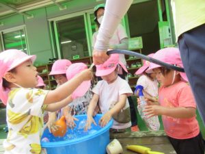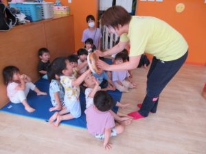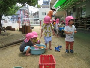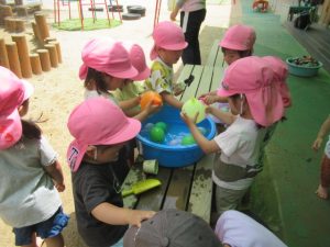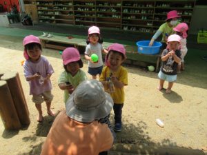 園庭に水を撒き、タライに水を溜めたり、水風船を浮かばせたり、お馴染みの霧吹きを用意して楽しみました。バシャバシャと顔にかかるのが嬉しくて笑いあったり、水風船をほっぺにベシャとつけて冷た〜と言って笑ったり、水遊びが楽しい季節になりました。中には水が苦手なお友だちもいるので、少しずつ慣れていけたらいいな。そんな様子も見ながら不安にならないように配慮していきたいと思います。来週からバスタオルのご準備お願いしますね!