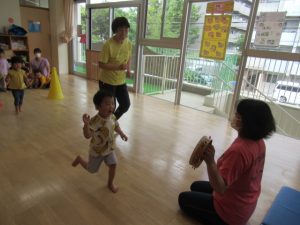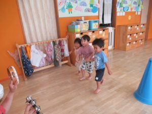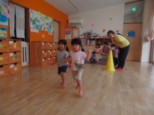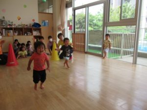 朝のお集まりの後、よーいドンで遊びました。ゴール手前に保育士がタンバリンと鈴を持っていて、どちらか好きな方にタッチをしてゴール!マットからマットへ移動する遊びです。名前を呼ばれたお友だちから順番にコーンの所に立ってスタート、呼ばれるまでは待つ事など簡単なルールを説明し、スタート!でも、なかなか待てなくて走り出してしまうお友だちや今から何が始まるのかな?とドキドキしてる子、様々ですが一つ一つ繰り返しながら楽しい経験の中で身につけていけたらと思います。友だちと2人組になってのよーいドン!は嬉しくて、ドキドキしていたお友だちも繰り返していくうちに友だちとなら!と笑顔でかけっこできてましたよ。