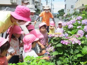 今日も暑かったので、園周辺の散歩に出かけました。アジサイはどこかなー?と絵本や毎日の散歩でお馴染みとなったアジサイを見つけると、あった!と大喜び。綺麗だねーと見つけたアジサイをじっくり見て、色んな形や色のアジサイを見つけて帰ってきました。