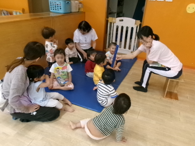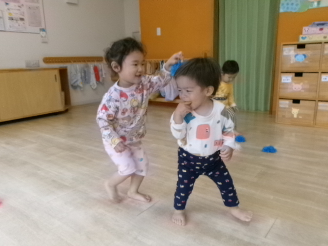 レインスティックという音の鳴るおもちゃで遊んでみました。中に入っている物が小豆だったりお米だったりで音が違うのでそれぞれどんな音が聞こえるのか耳に当てて聞いていました。お友だちに貸してと言われたらどうぞと貸してあげる姿もあって優しいどんぐりさんにほっこりとした気持ちになりました(*^^*)