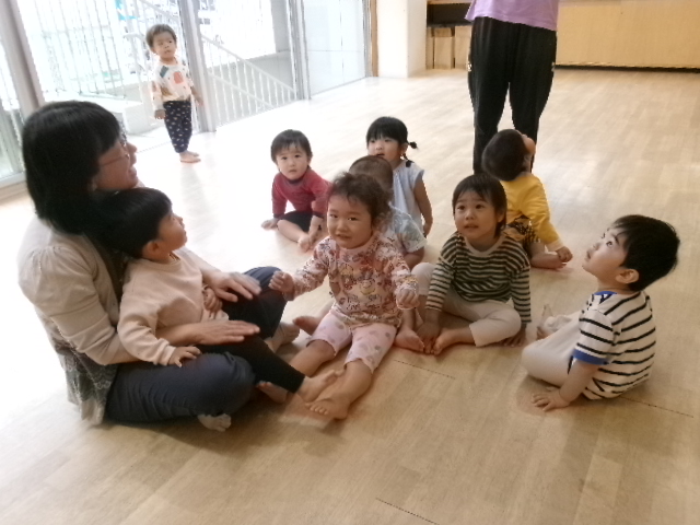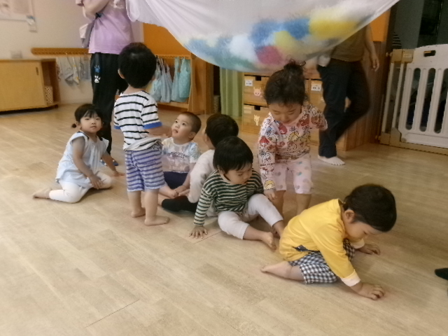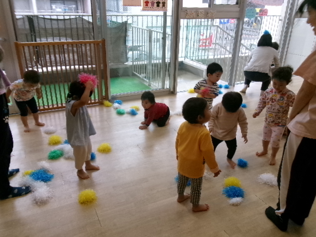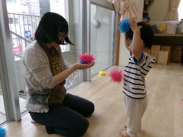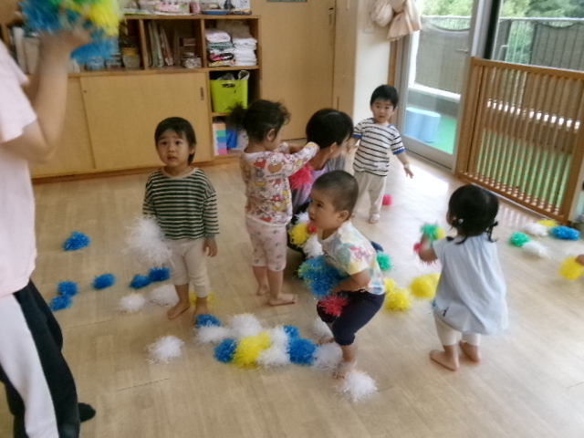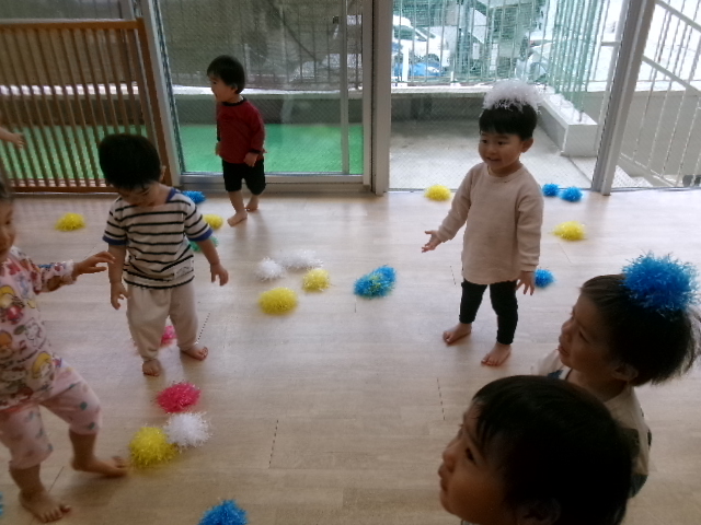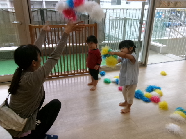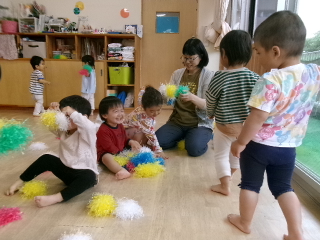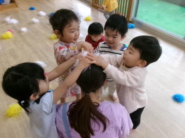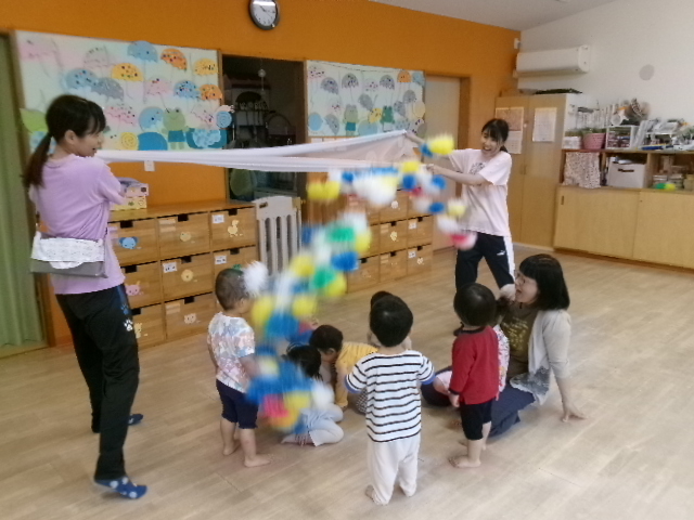 いろんな色のポンポンを両手いっぱいに持って降らせたり、降ってくるのを見て喜ぶどんぐりさんです。ポンポンを頭に乗せてこんにちはと挨拶するとポンポンが落ちてきて「あれ!?」と保育士が言うのがおもしろくて笑ったり、自分で頭の上にも乗せようとしたりしていました。オーガンジーに集めて大風こいの歌を歌って一気に降らせると「キャー!!」とまたまた大喜びです。もう一回、もう一回と何度もリクエストしてくれるぐらい楽しんでいましたよ。