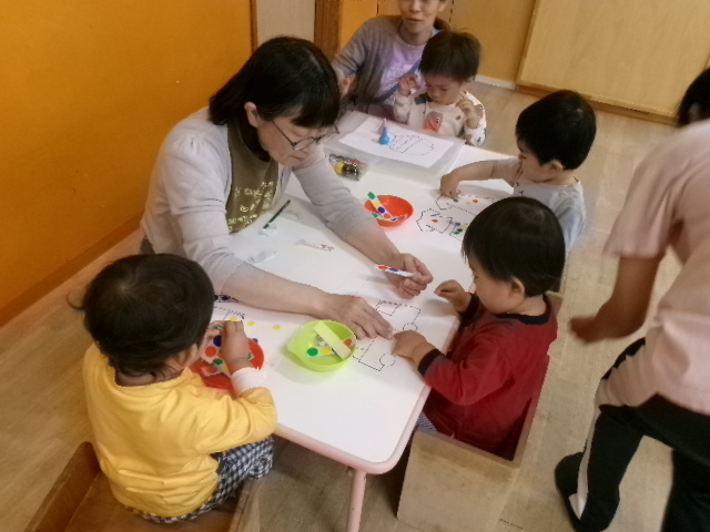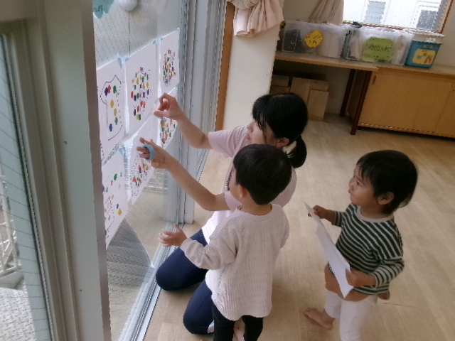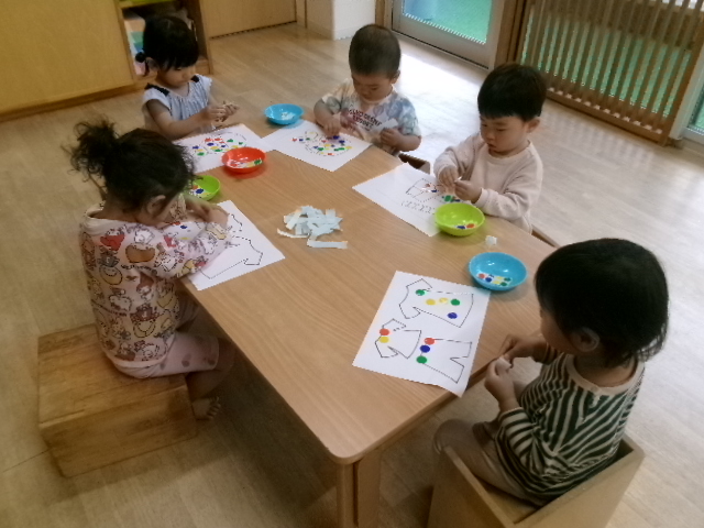 魚と消防車、お洋服の紙を用意して好きな紙にシールを貼ったり、お団子ペンで色を塗りました。シールを剥がすのが難しそうにしていたら台紙を折って剥がしやすくすると自分で貼れるようになって「やったー!」と手をぱちぱち拍手して喜ぶお友だちや、自分の好きな模様になるようにたくさん貼るお友だちもいました。「まだしたい!」のお友だちは2枚、3枚とたくさん貼っていましたよ。出来上がった作品は持ち帰りますのでお家で一緒に見てあげてくださいね(^^)