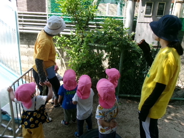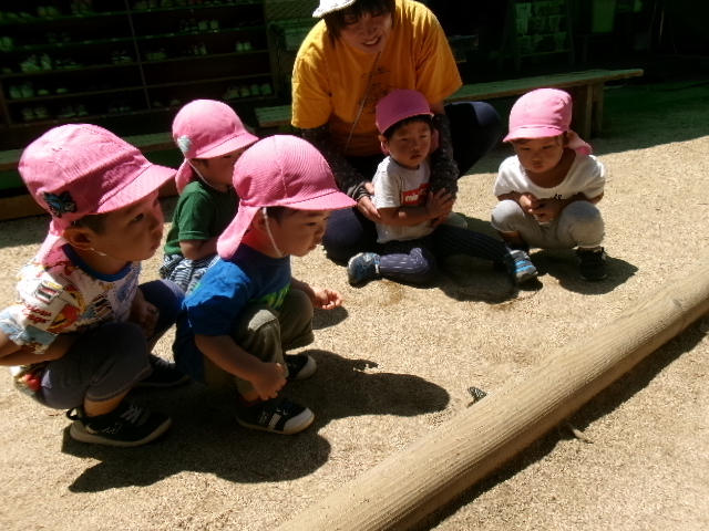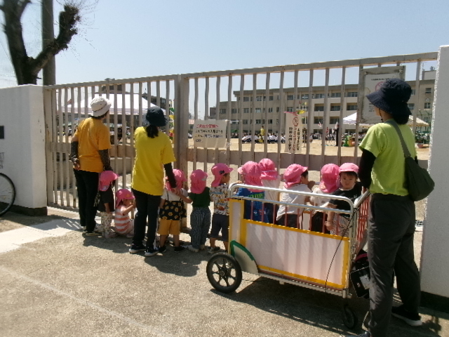 今日は近くの中学校の運動会でした。少しだけ覗きに行こう!と早くに朝の集まりをして見に行きました。学校に近付いてくるとなんだか賑やかな声や音楽が聞こえてくると「いこう!みにいこう!」と小走りで急ぐ子どもたち。グランドの外からじーっと競技を見て「頑張れー!!」と可愛い応援団のどんぐりさんたちでした。