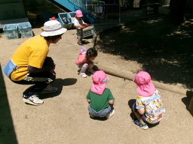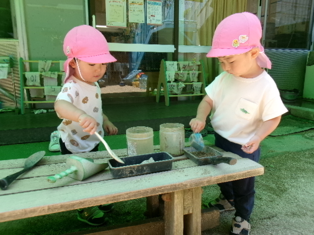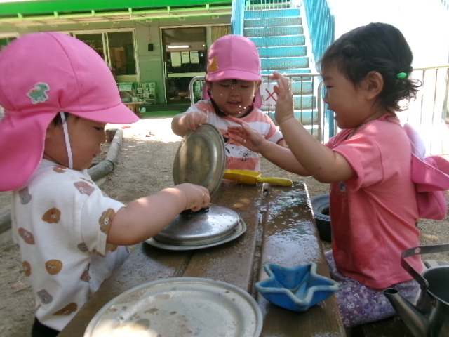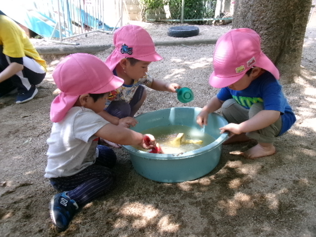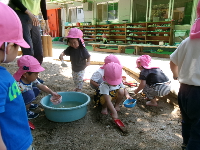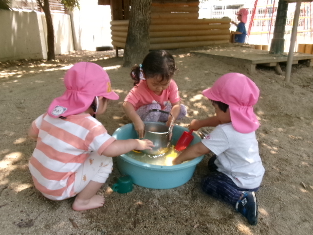 園に戻って来て、タライに水を入れて砂場でホッコリ。