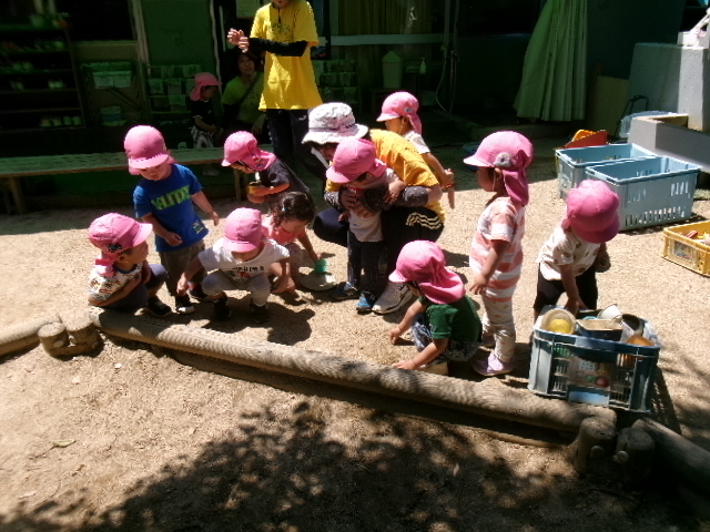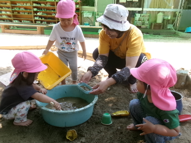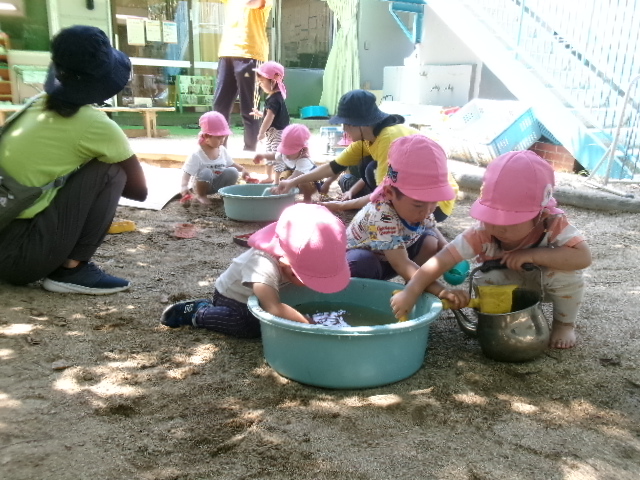 みんなタライの周りに集まって水をすくったり、泥水や泥んこでたのしんでいました。