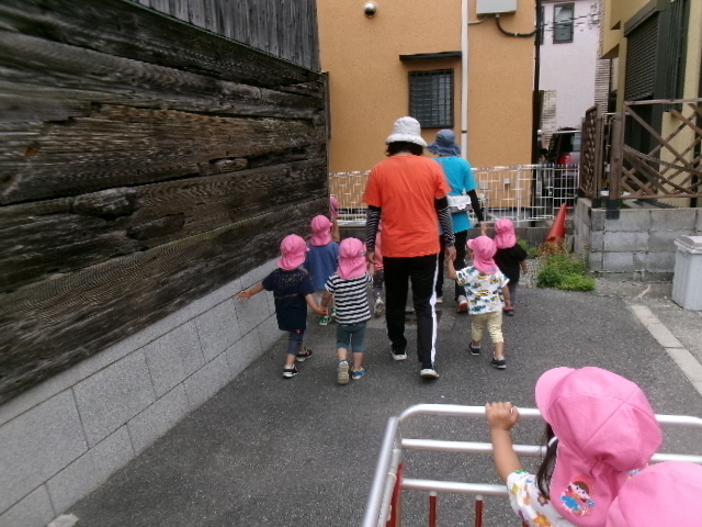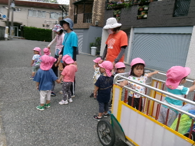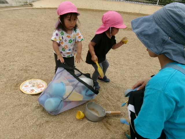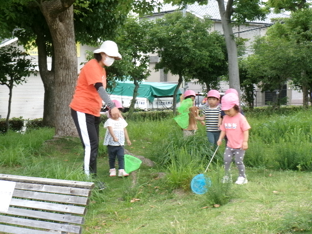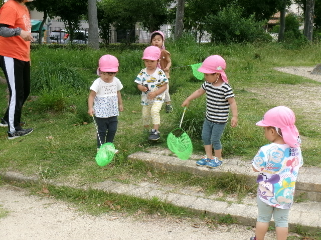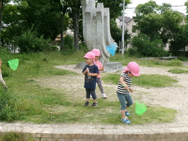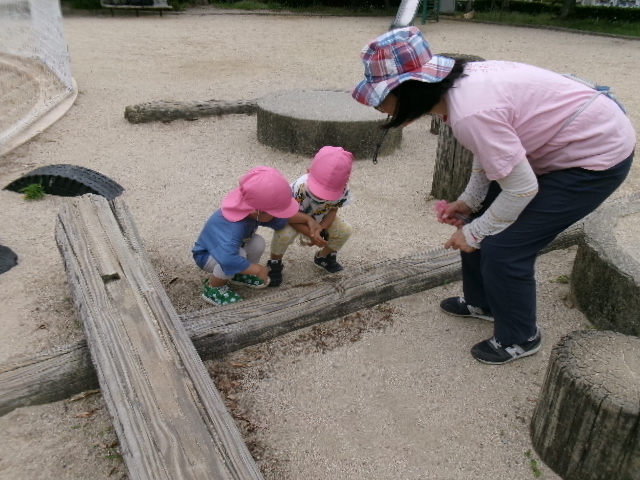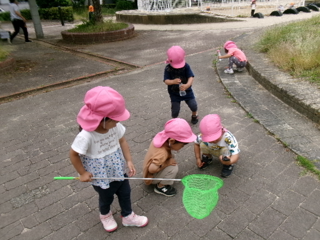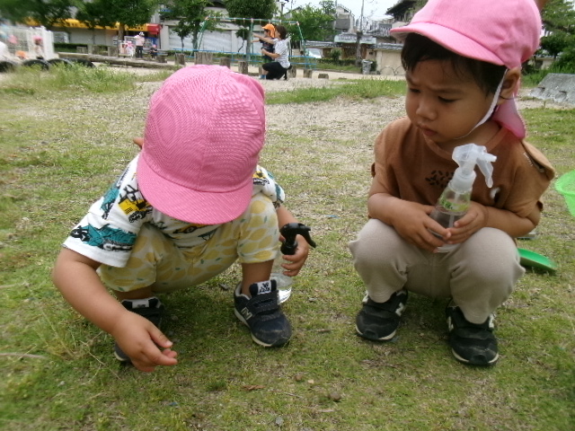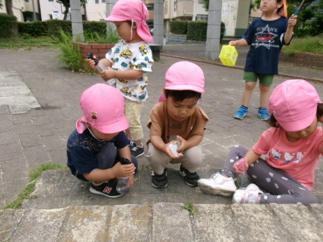 ちょうちょが飛んでくると子どもたちは追いかけていそがしそうに遊んでいました。霧吹きを木の遊具に吹き付けると、「色ガ変ワッタ!」と発見したお友だちもいましたよ。「オ花ニオ水アゲヨウ」と霧吹きしてあげる姿もあり、ほっこりしました。