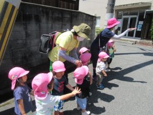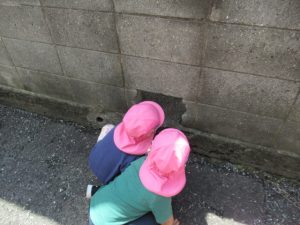 今日はとっても良い天気!お集まりの後に少しだけブラブラ散歩に出かけてきました。守部神社の周辺を散歩して、のぞき穴を覗くと〜!?昨年から来ているお友だちはよく知っているのですぐに覗いていて、4月から来たお友だちは何してるの?と言った感じで、不思議そうに様子を見ていたり通り過ぎたり、、、。覗いてごらんと促すと、「うわー!!!!」と頭を穴に入れ込んでまで覗き込んでいて可愛かったですよ!ブラブラ散歩には色んな発見、小さな楽しみがたくさんです。ホッコリ楽しんで帰ってきました。