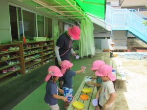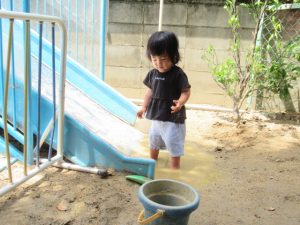 園庭ではシャボン玉や、虫探しや、タライに水を溜めて遊びました。裸足になるのが苦手でなければ靴を脱いであそんでいます。これから泥んこあそびなどもしていきます。衣類が泥で汚れてしまう可能性もありますが、ご理解の程よろしくお願いします。今日は人数も少なくホッコリ遊びました。