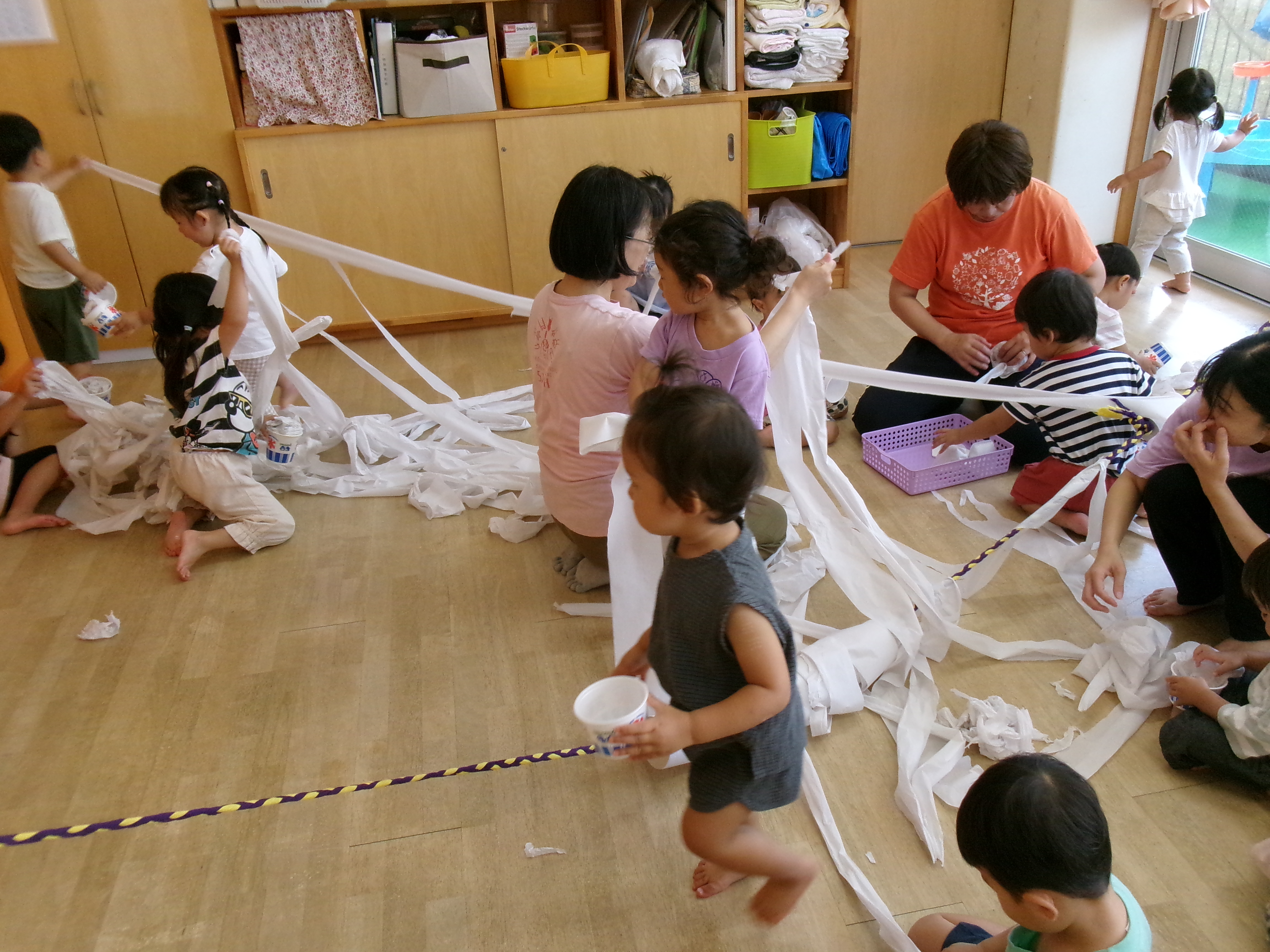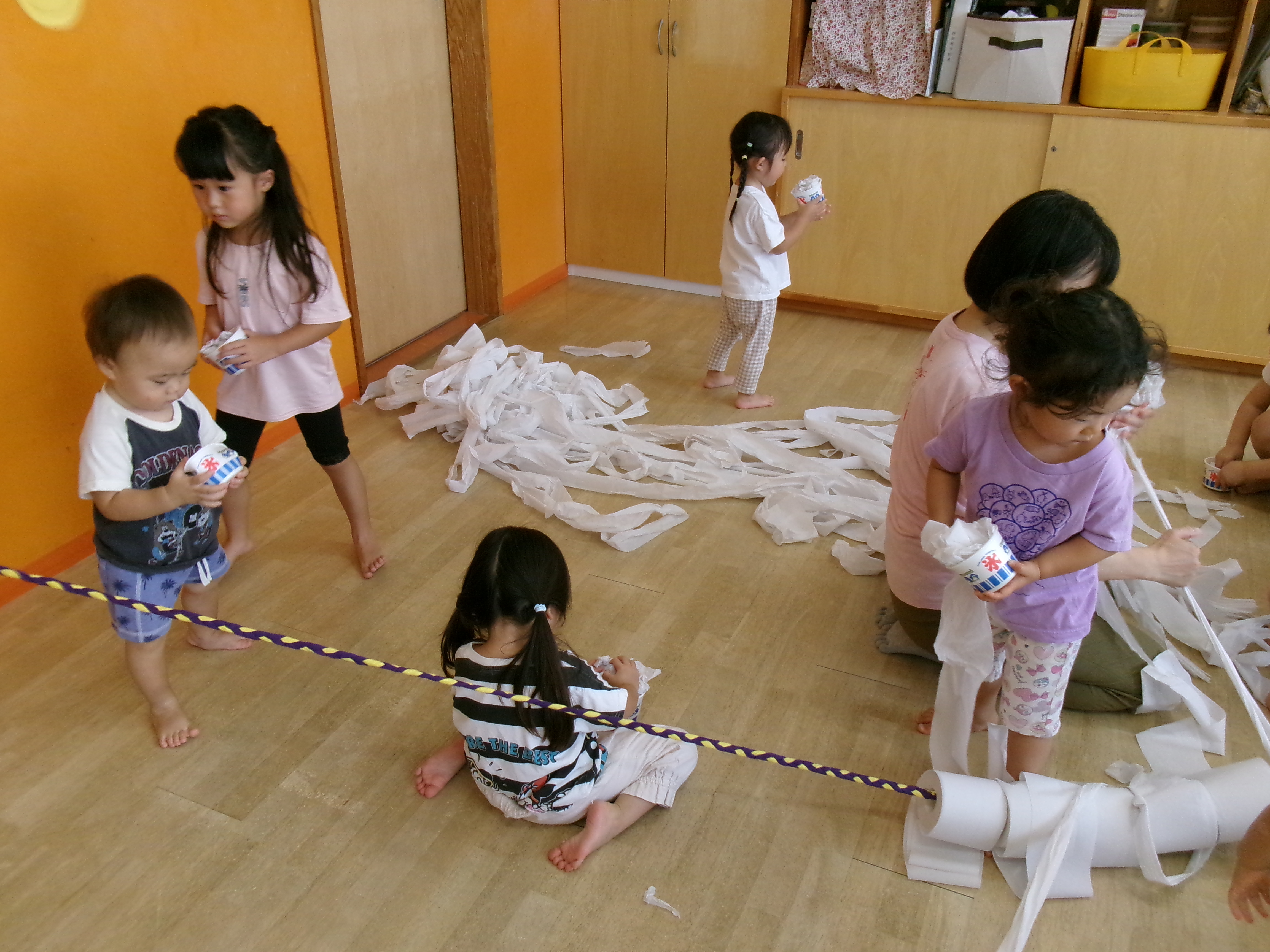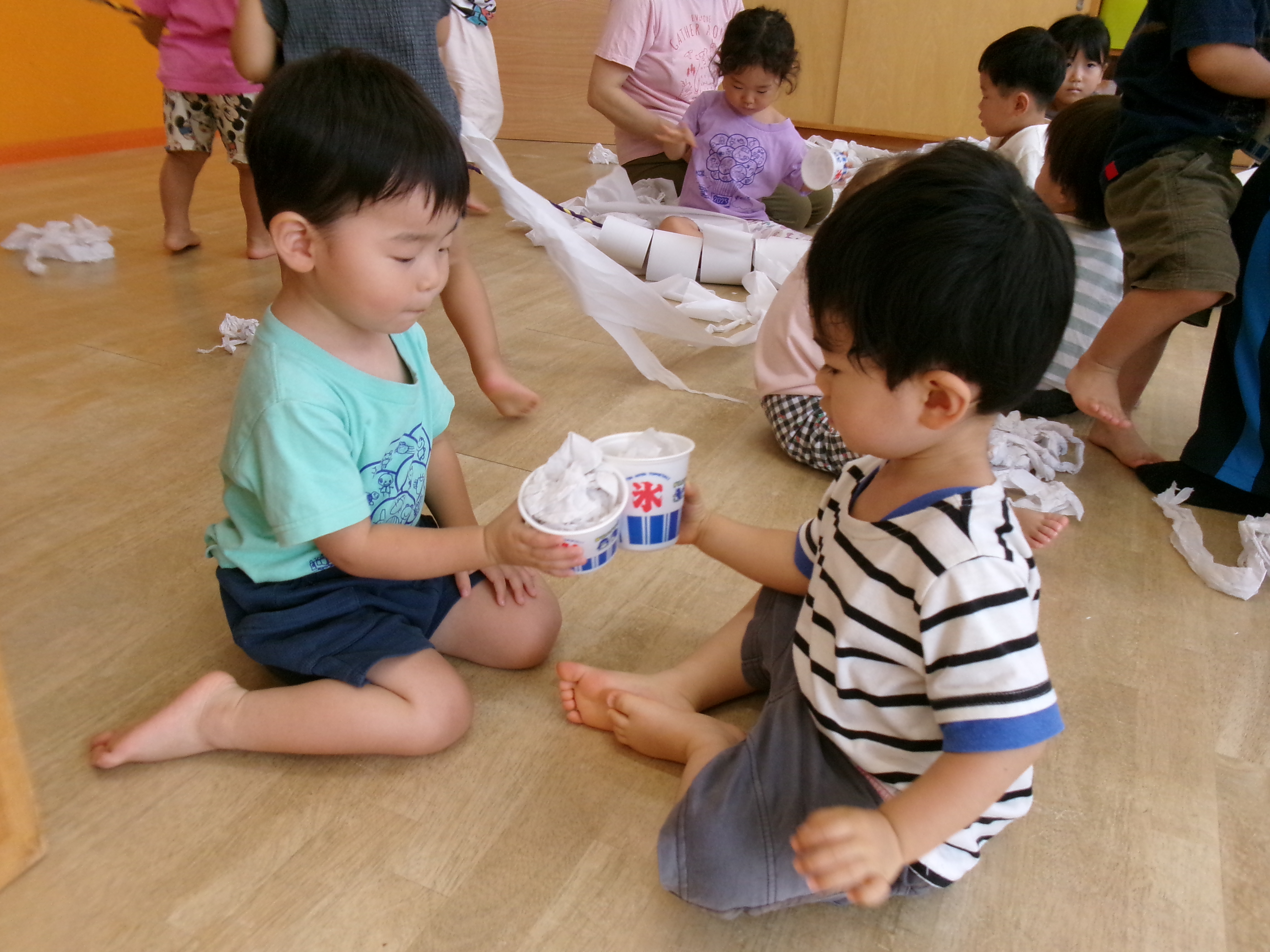 トイレットペーパーを氷に見立てて、それをシュンシュンと引っ張ります!今日は大胆に部屋中真っ白になるぐらい!シュンシュンシュンシュン!いっぱいやねー!とたくさん削ったら、かき氷の容器に食べたい分だけ入れたらみんなの好きなシロップをお店屋さんにかけにいきました。