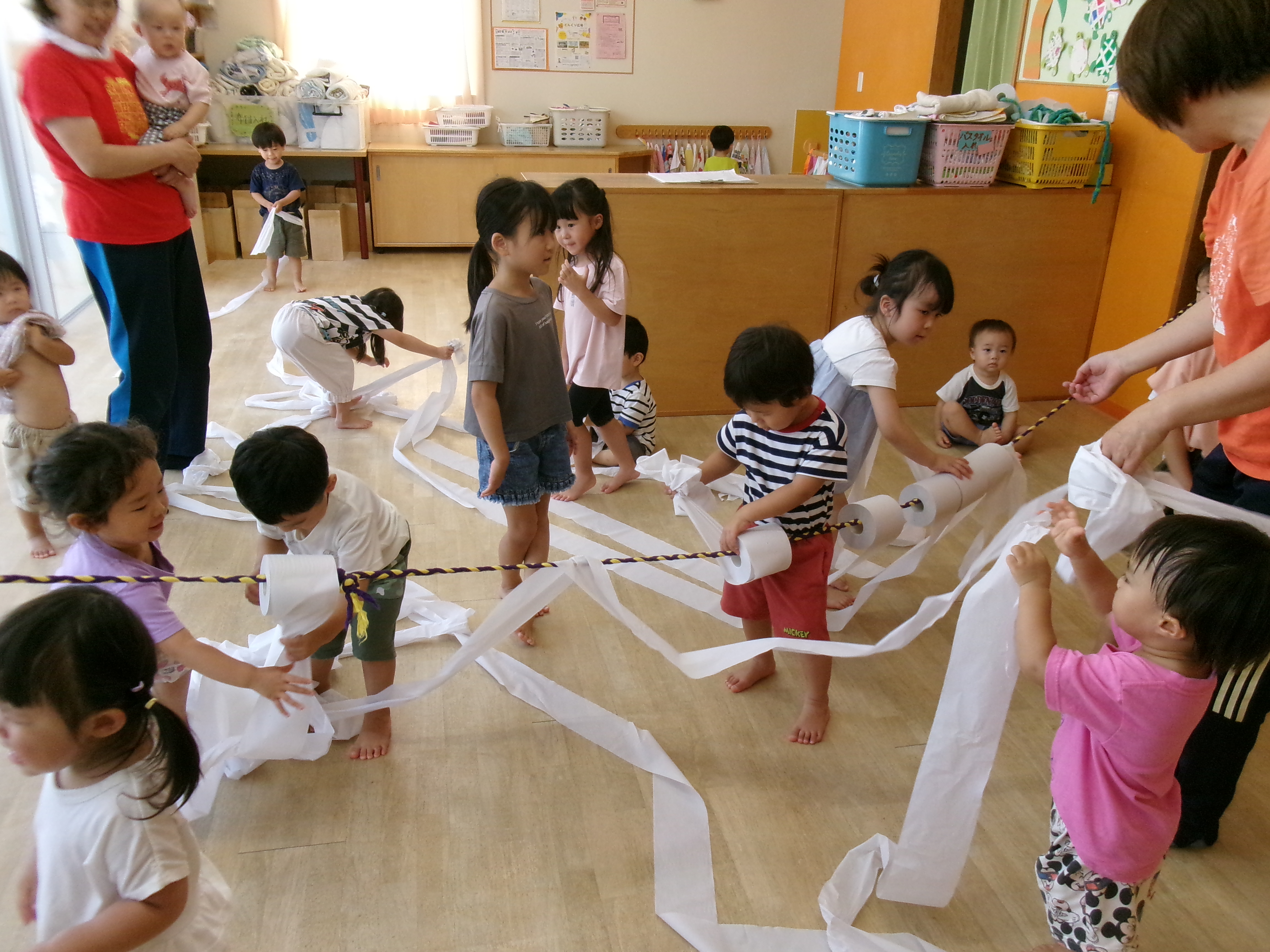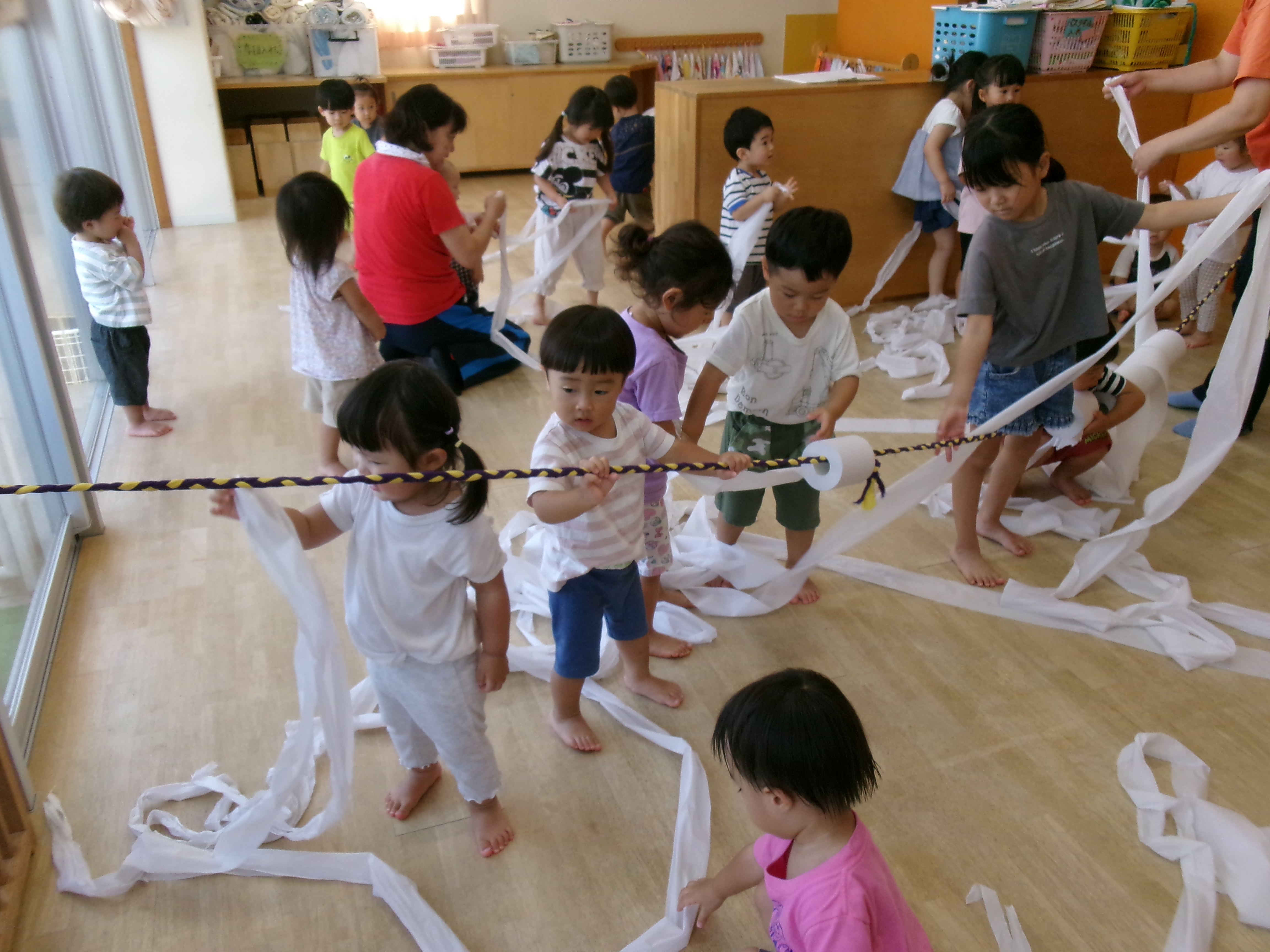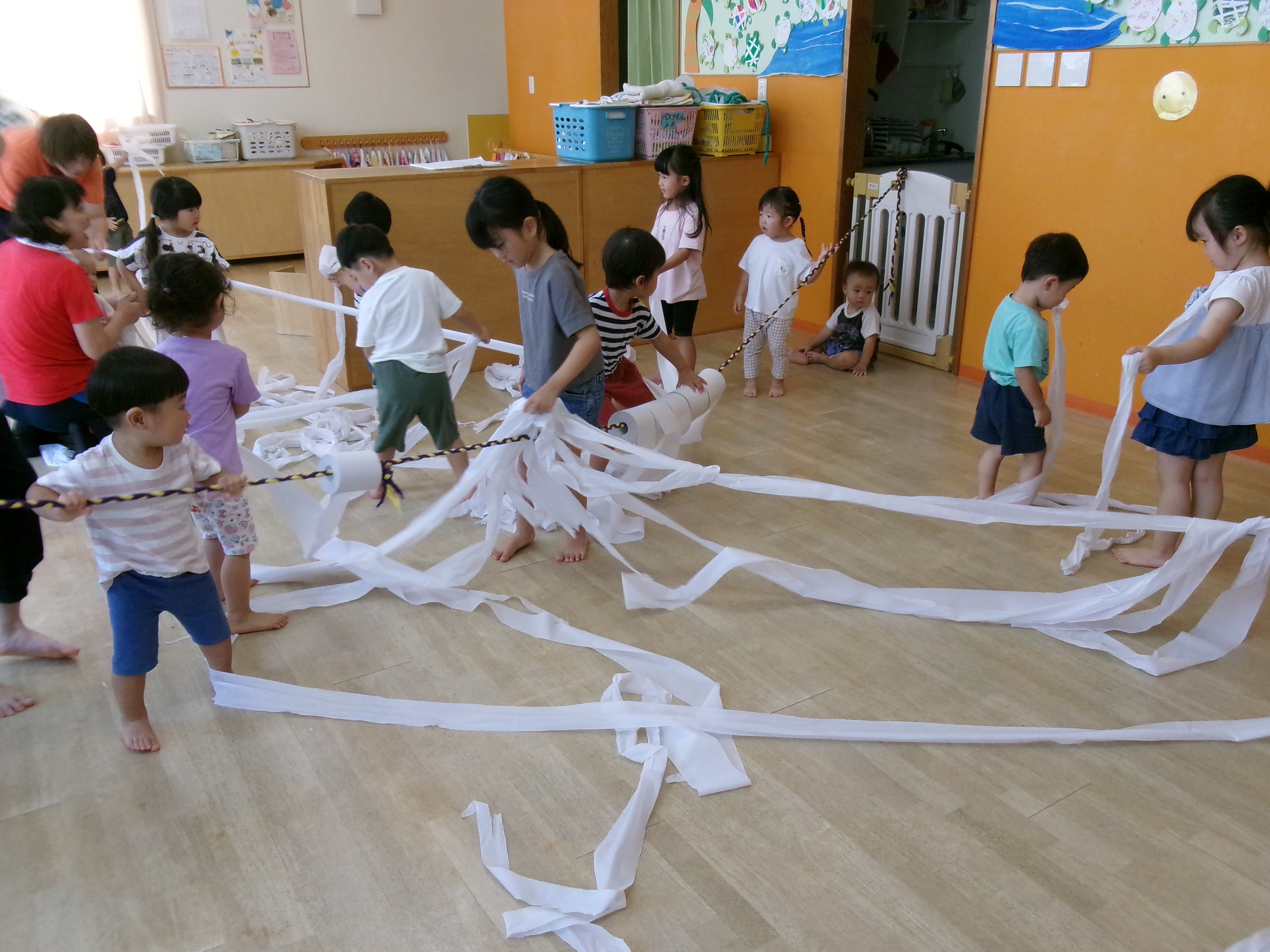 トイレットペーパーを氷に見立てて、それをシュンシュンと引っ張ります!今日は大胆に部屋中真っ白になるぐらい!シュンシュンシュンシュン!いっぱいやねー!とたくさん削ったら、かき氷の容器に食べたい分だけ入れたらみんなの好きなシロップをお店屋さんにかけにいきました。