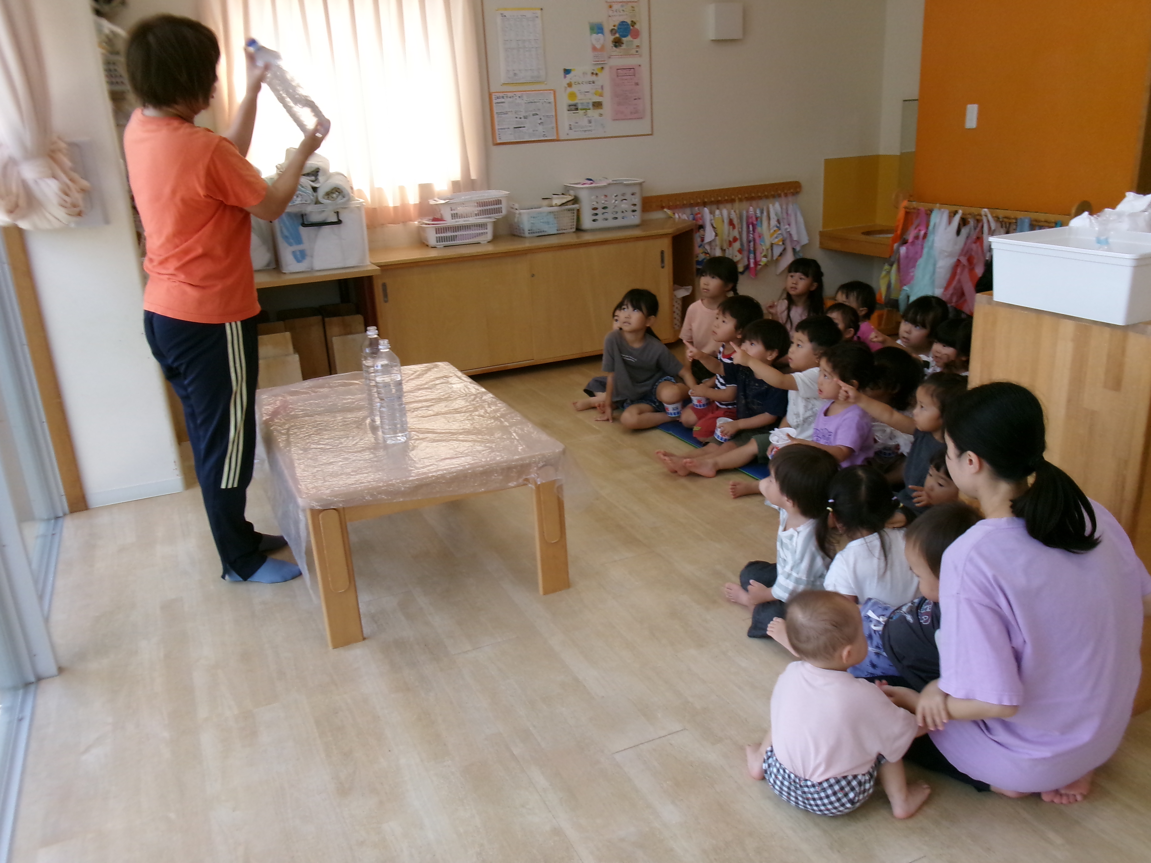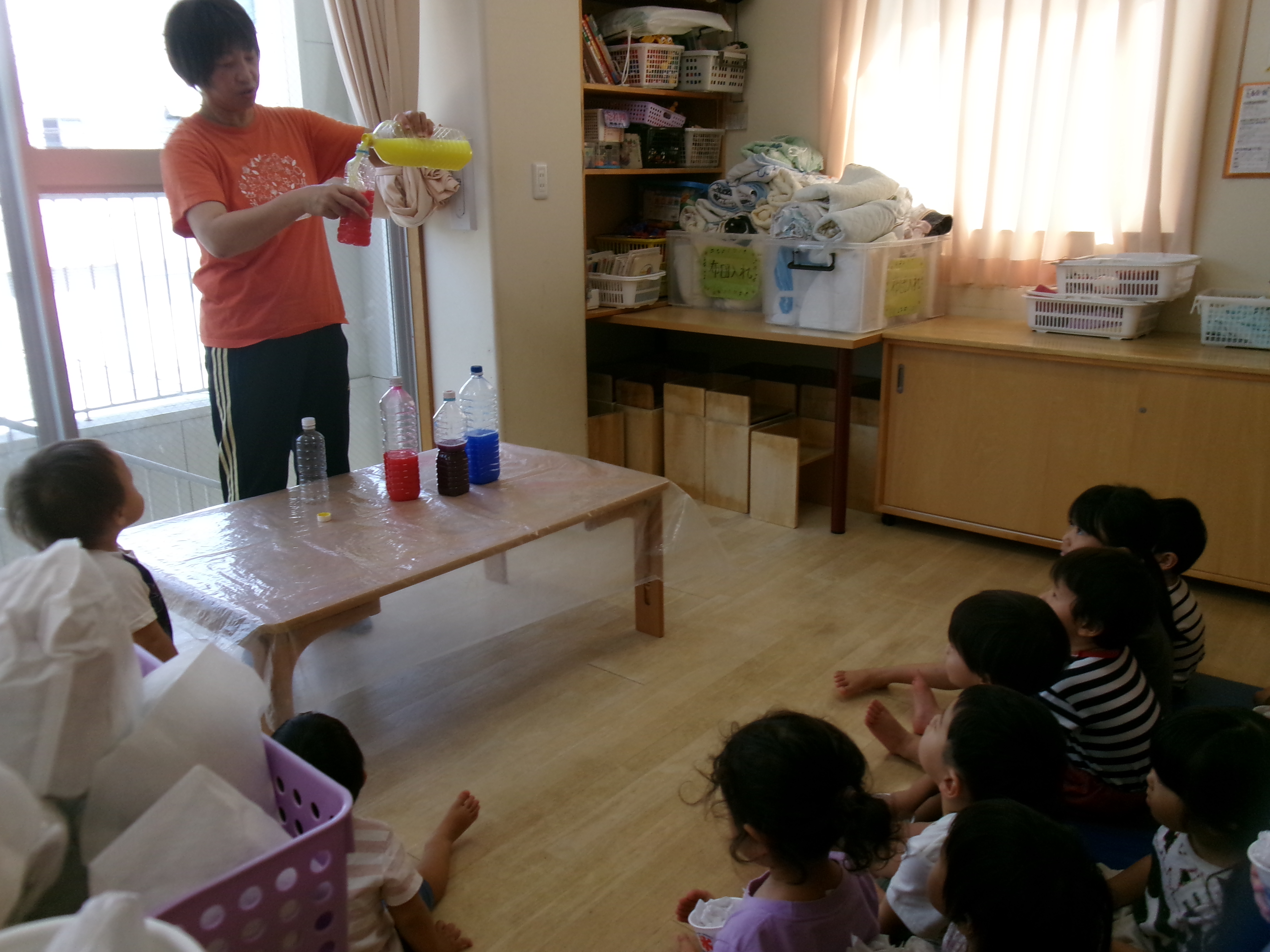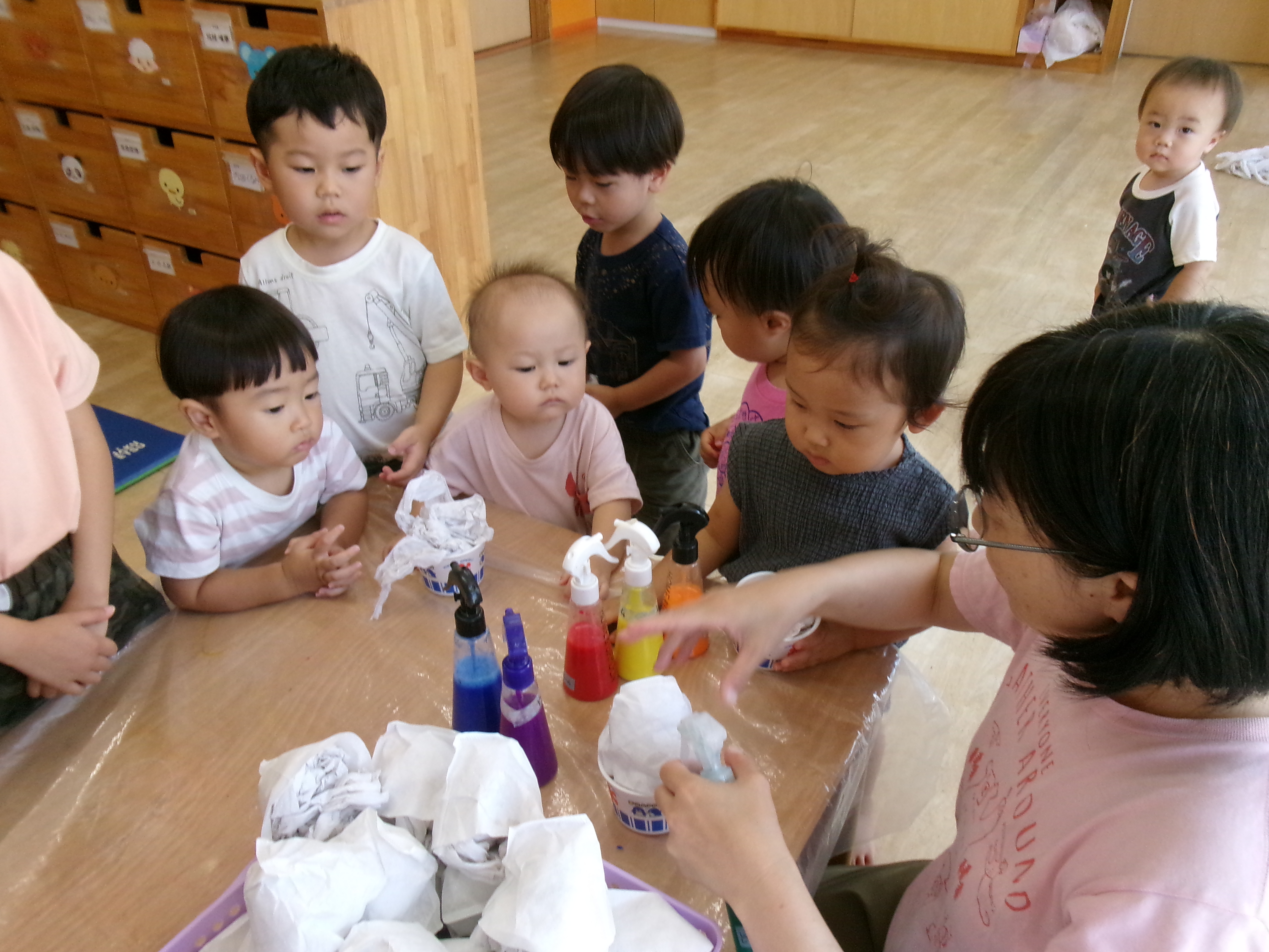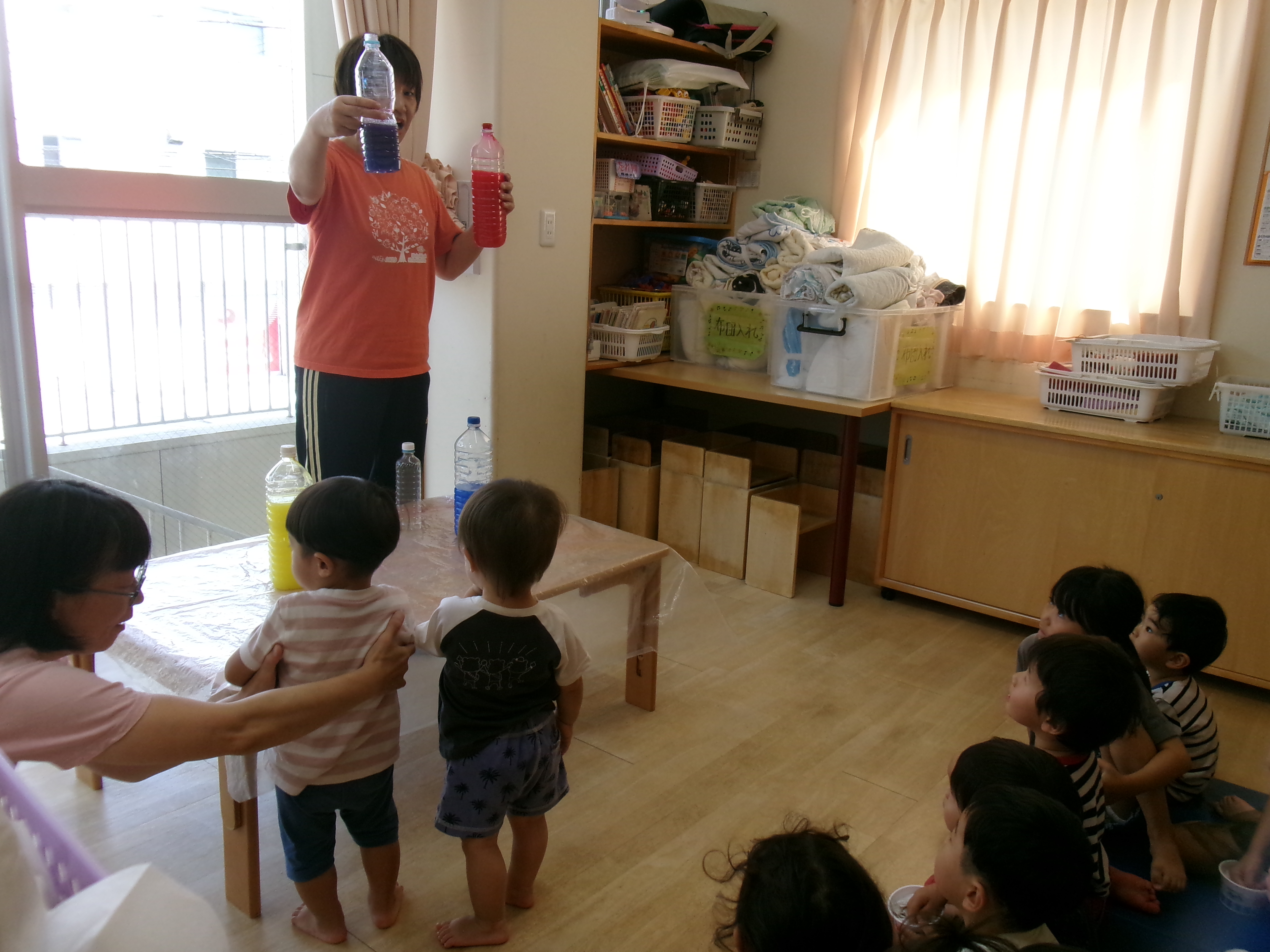 幅の広いお友だちなので、幼稚園のみんなが遊び方を教えてくれるチャンスの毎日なので、今日は色水遊びをしよう!と考えました。