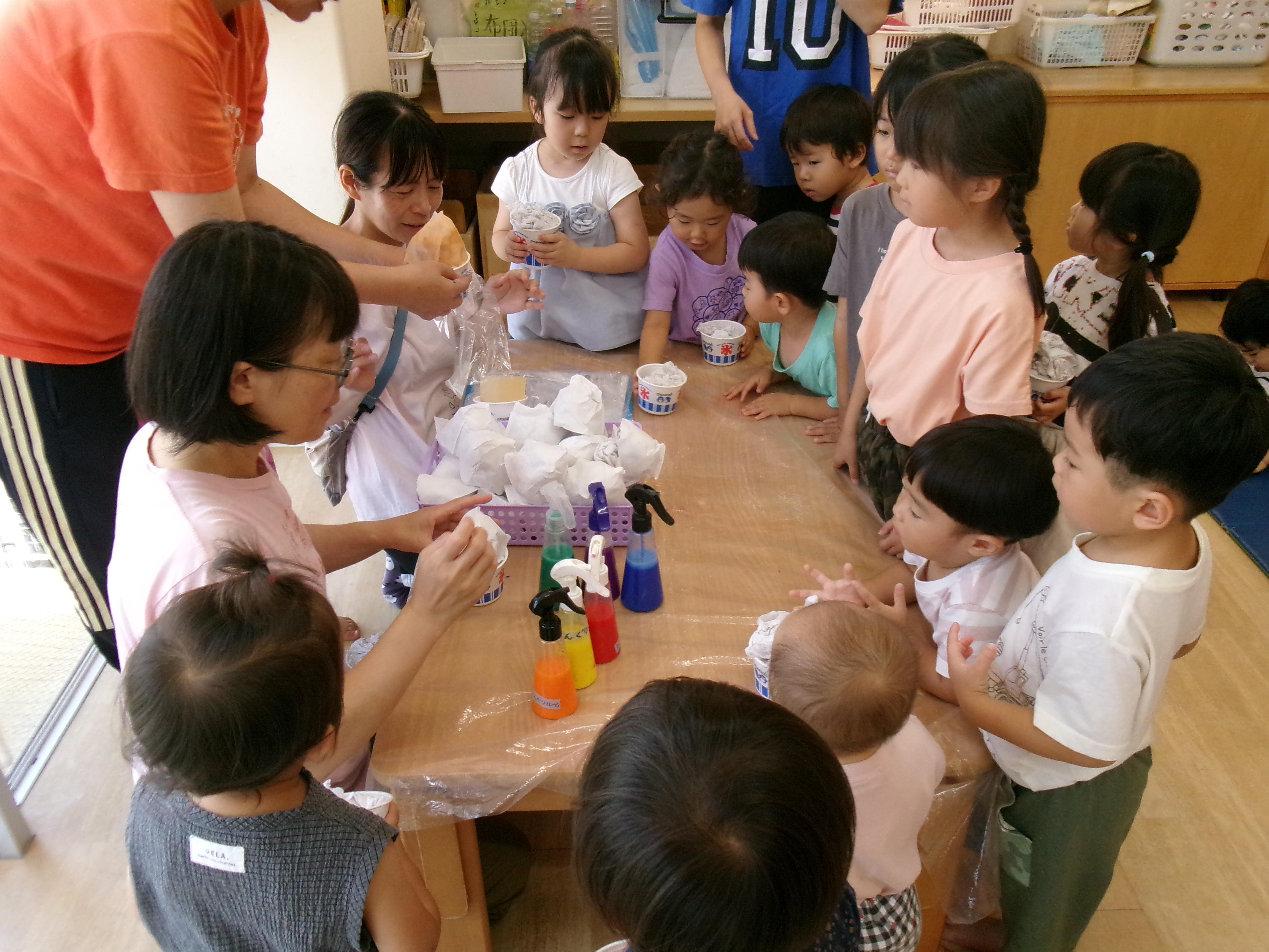 でもでも、ぶどうやコーラーもありましたが、オレンジ、メロンも食べたい!と言っていたので今度は3色の色をそれぞれ混ぜて行くとー、みんなの好きな色も出来上がりました!さあ!出来上がったのでみんなの好きなシロップをかけて溶けないかき氷の出来上がり^_^