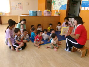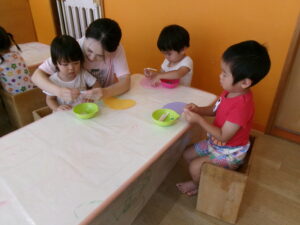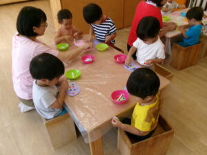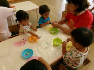 壁面飾りは、きのこにシールを貼って制作しました。シール貼りも繰り返て遊んでいるので、大人の手を借りずに上手に貼れる様になって来ましたよ。「もっとちょーだい」とたくさんシールを貼りたい子どもたちがいっぱいいました。