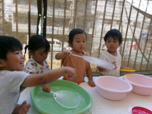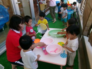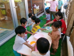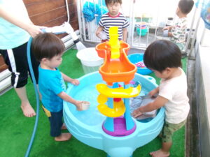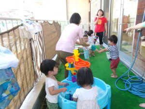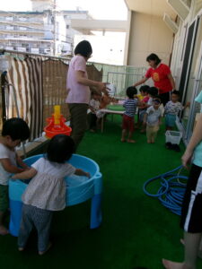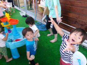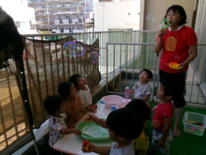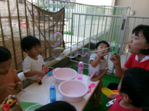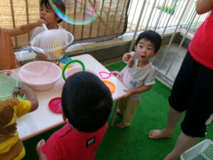 今日は、テラスに出て水遊びやシャボン玉遊びをしました。