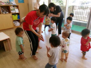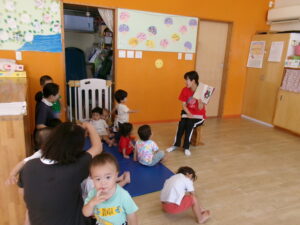 おあつまりにキリンさんとライオンさんとおさるさんの小さいお友だちが来てくれました。皆で「おはようございます!!」と元気にご挨拶しました。そのあと、「ははははは」という絵本を読みました。