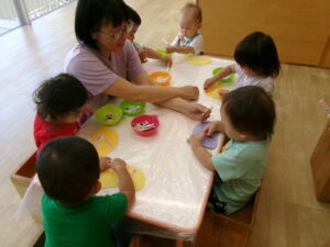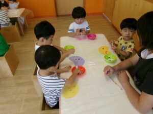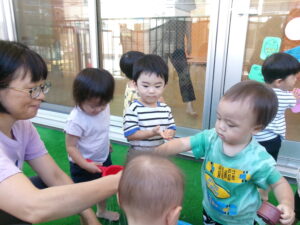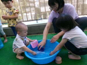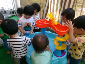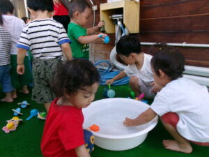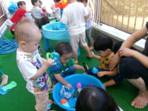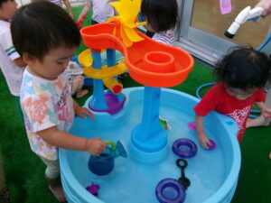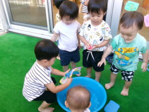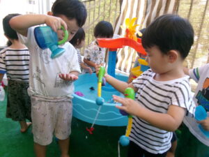まだ暑いので、水あそびを楽しみました。ジョウロやマヨネーズの容器、お魚つりなど、色んなおもちゃであそびました。