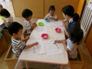 画用紙のきのこにシールをたくさん貼って、9月の製作をしました。昨日貼ったお友だちは、好きな絵にシールを貼りました。
