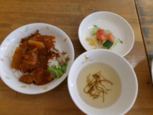 毎年この時期に、「今年の夏もプールでたくさんあそんだね!」と、むこっこ保育園の年長さんがカレーを、年中さんがサラダを作ってくれて、カレーパーティーをしています。(スパイス等も入っているので2歳児まではハヤシライスになります)