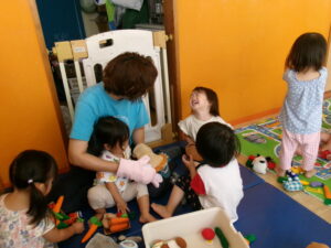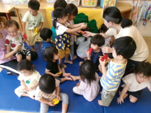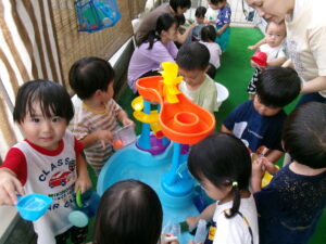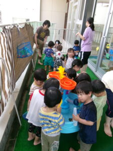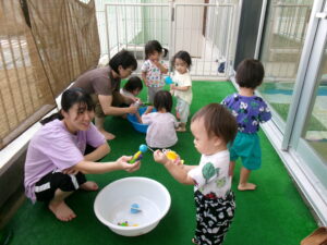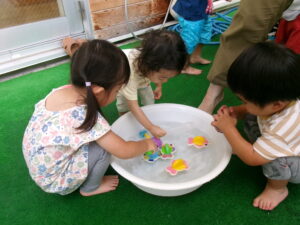 ベランダで魚釣りや、的あてなどで遊びました。まだ気温も高いので、ホースで水をまいてたりしながら涼みつつ水遊びを楽しんで行きたいと思います。