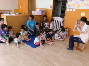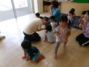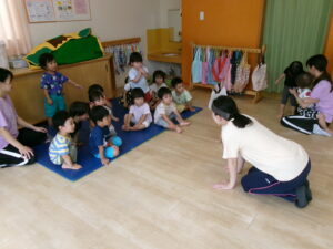 「いいおへんじできるかな」の絵本を読みました。ねこはにゃーと、いぬはわんわんと返事をしていて、どんぐりのみんなはどんな返事をするのかな?どんぐりさーん!と呼んでみると、「はーい!」と、とっても元気は返事が聞こえました(^^)今日も元気などんぐりさんです(^^)
