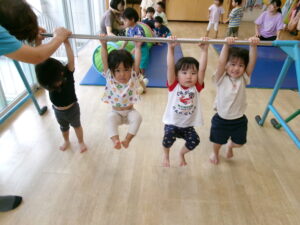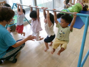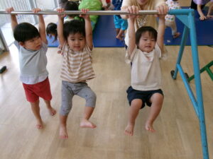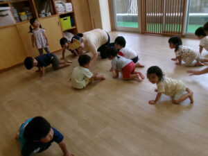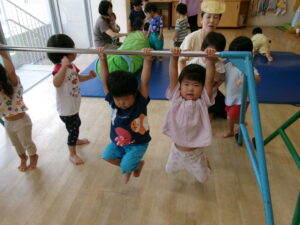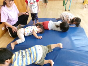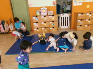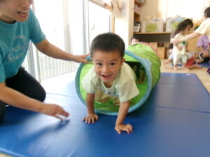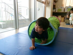 猫さんが見つけた公園で、鉄棒はぶらーんとぶら下がり、ふわふわ坂道は四つん這いや横になって転がり、トンネルは同じ場所から入ります。どんぐりのみんなも遊んでみよう!と順番に遊びました。鉄棒では足をしっかり上げてぶらーんとぶら下がることができる子がたくさんいて、ねこちゃんもビックリ!転がっリハイハイしたりと、公園でたーくさん遊んだどんぐりさんです(^^)