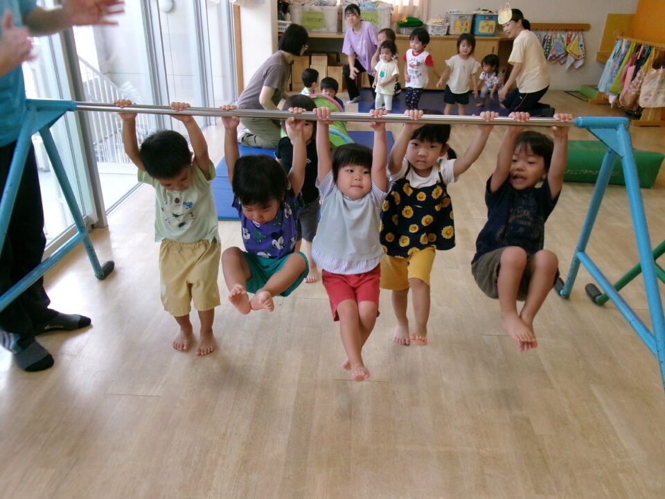 猫さんが見つけた公園で、鉄棒はぶらーんとぶら下がり、ふわふわ坂道は四つん這いや横になって転がり、トンネルは同じ場所から入ります。どんぐりのみんなも遊んでみよう!と順番に遊びました。鉄棒では足をしっかり上げてぶらーんとぶら下がることができる子がたくさんいて、ねこちゃんもビックリ!転がっリハイハイしたりと、公園でたーくさん遊んだどんぐりさんです(^^)