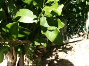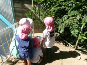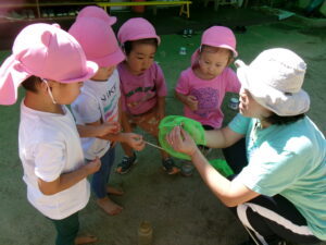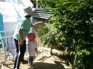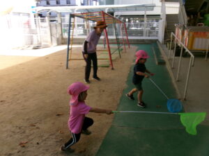 虫網を片手に蝶々を追いかけていると、園庭のみかんの木に青虫🐛がいてみんなで観察しました。