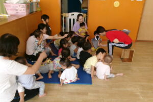 ペープサートのシルエットクイズをしました。食べ物の時は、うそっこでパクッと食べますが、動物が出てくると、ヨシヨシとなでる真似っこをしていましたよ!そのあとは、「おいもさんがね」の絵本を読みました。最後に焼きいもになったのを、みんなでフーフーしながら食べました。