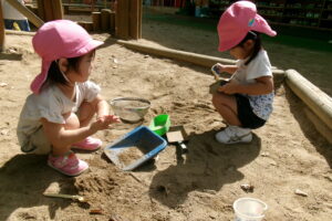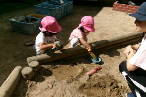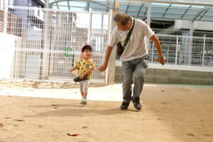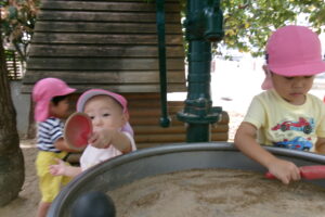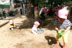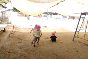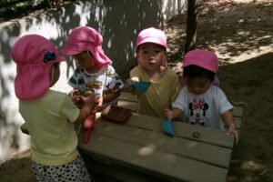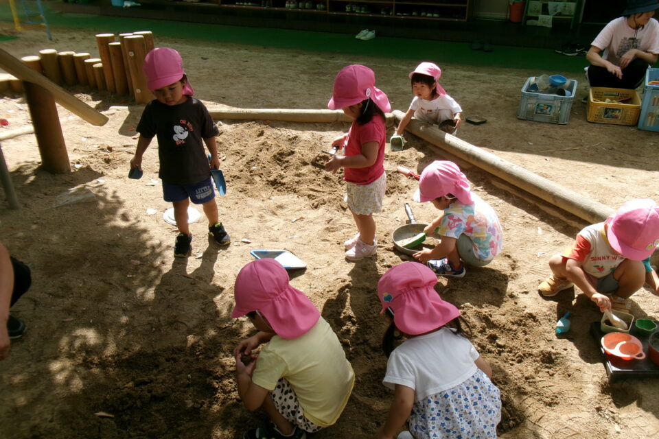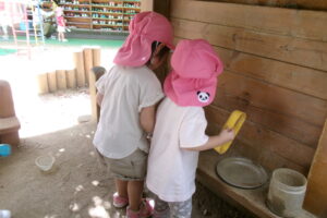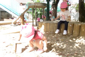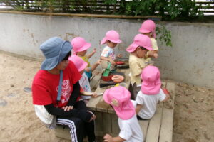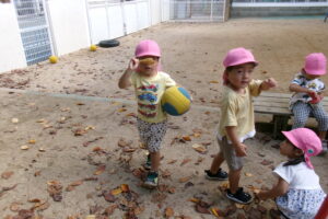 今日も園庭でたっぷりあそびました!落ちている木の実で豆ご飯を作ったり、飲み物も用意して、テーブルとベンチに運び、パーティーごっこが始まりました!小屋の中からは、小さいお友だちが、「ばぁ!」と顔をのぞかせてくれて、ほっこりでしたよ。黄色くなった落ち葉に目や口の穴を開けて、「おばけだぞ〜」と追いかけっこを楽しんでいる子もいました。
